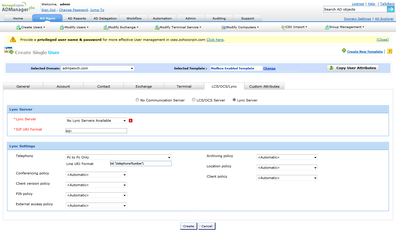 Create new Lync/LCS/OCS accounts for users, right at the time of creating their Active Directory accounts. In fact, via its customizable user provisioning templates, this tool empowers you to create new accounts for users in Active Directory, Lync/LCS/OCS, Exchange Server, Office 365 and Google Workspace, all at once automatically. Moreover, with this tool's bulk user creation ability you can also create multiple new user accounts in one shot.