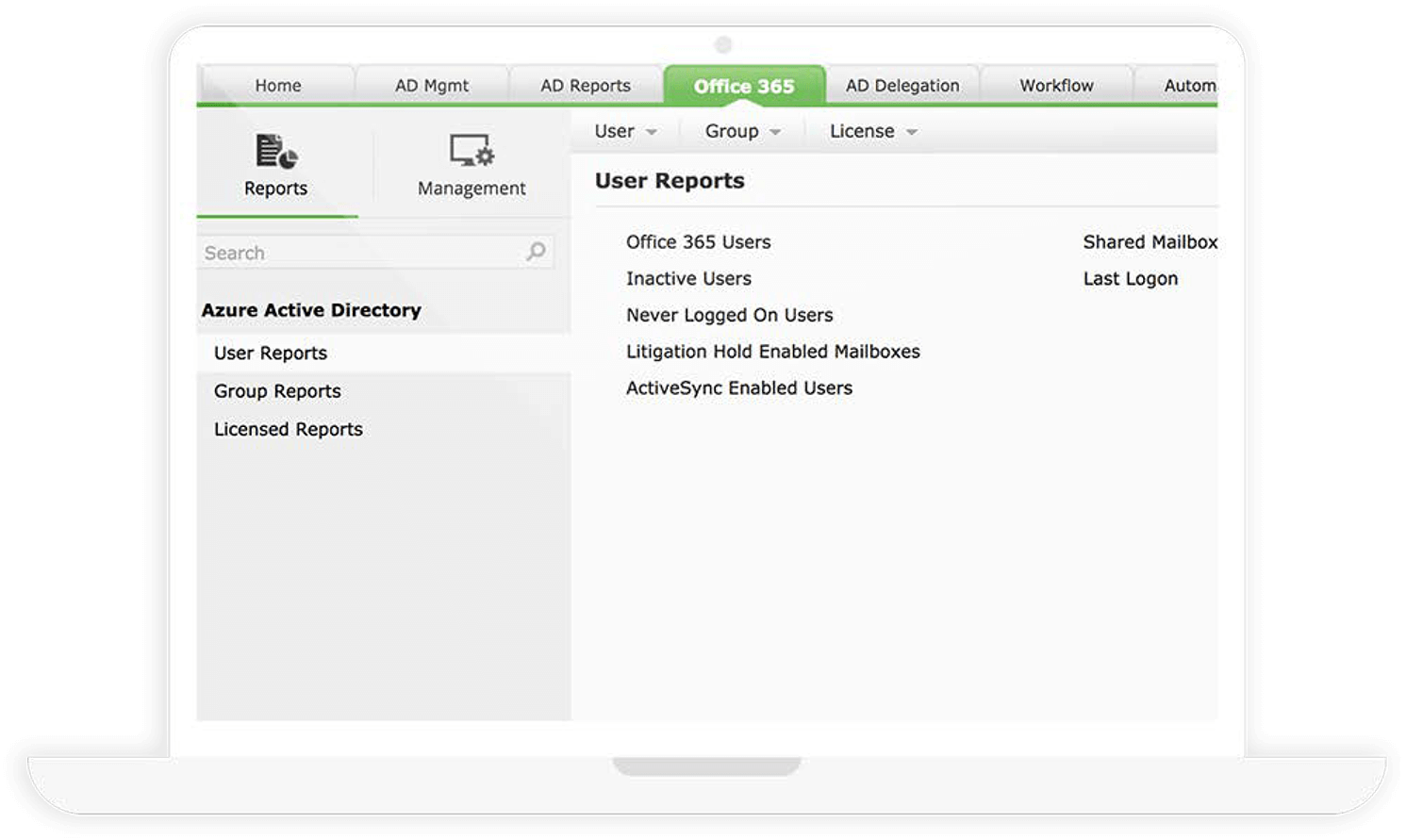 Aside from juggling both on-premises and cloud environments, admins have to provision and manage user identities, access to cloud-based resources, and cloud platform licenses. To manage Office 365, IT admins have to grapple with Active Directory (AD) tools, the Office 365 admin center, the Exchange admin center, PowerShell, and more.