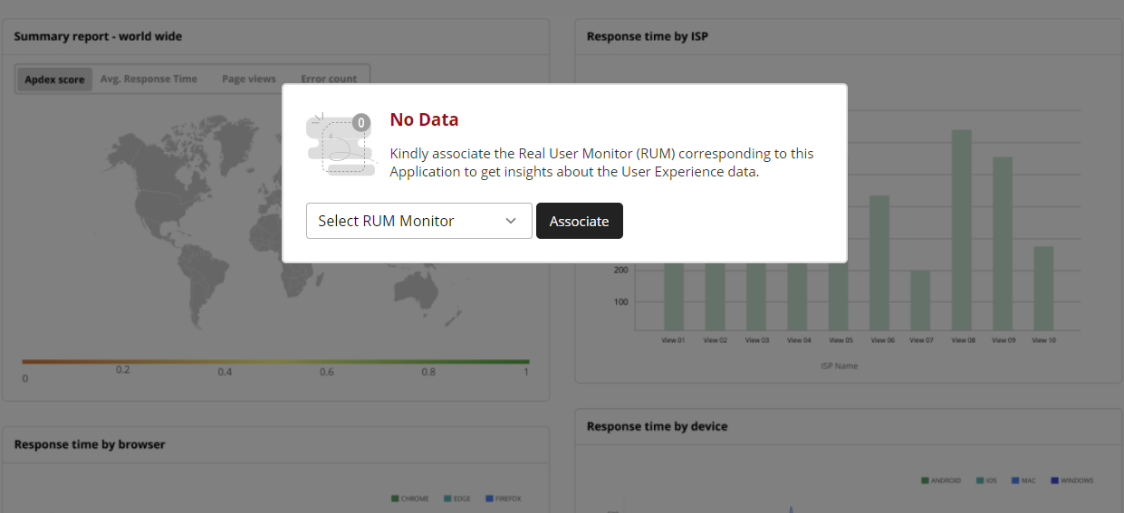 To set up the integration, select the required RUM Monitor from the dropdown and click on Associate. With this, data collected from the selcted RUM Monitor will be displayed for the integrated APM Insight application.