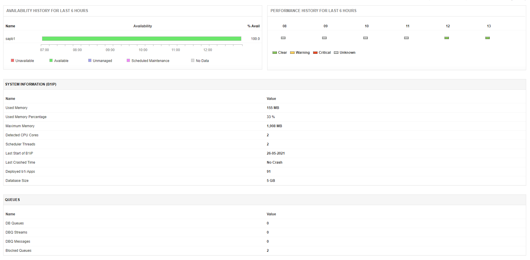 With Applications Manager's SAP Monitoring, become aware of health, availability, and system information of your SAP Business One ERP server at a single glance. Keep an eye on critical metrics like memory usage and CPU usage to understand how the overall performance of your ERP server is. Information such as DB Queues, DBQ messages are also available at your disposal.
