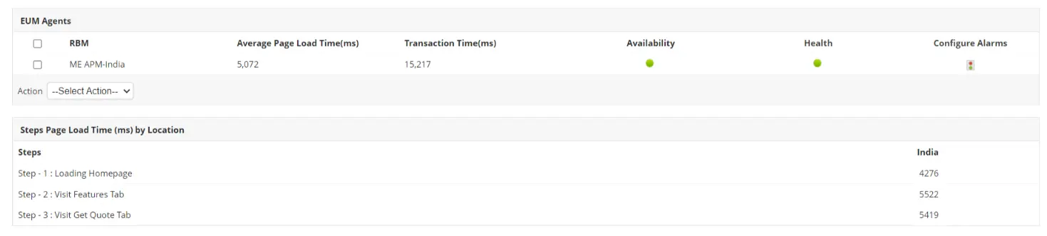 Using the Synthetic Transaction Monitoring recorder, you can easily record web transactions, and then replay the sequence in EUM agents. The recorded sequence is played back in a browser to mimic user behavior and collect the necessary metrics, which are sent to Applications Manager's Synthetic Transaction Monitoring Tool, providing a consolidated view of the data collected across all the agents for easy perusal.