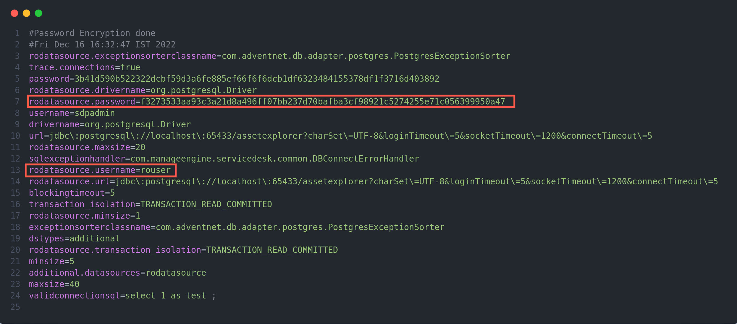 - Fetch the encrypted password key and configure it in the relevant tag. For example: rodatasource.password=<password>.
