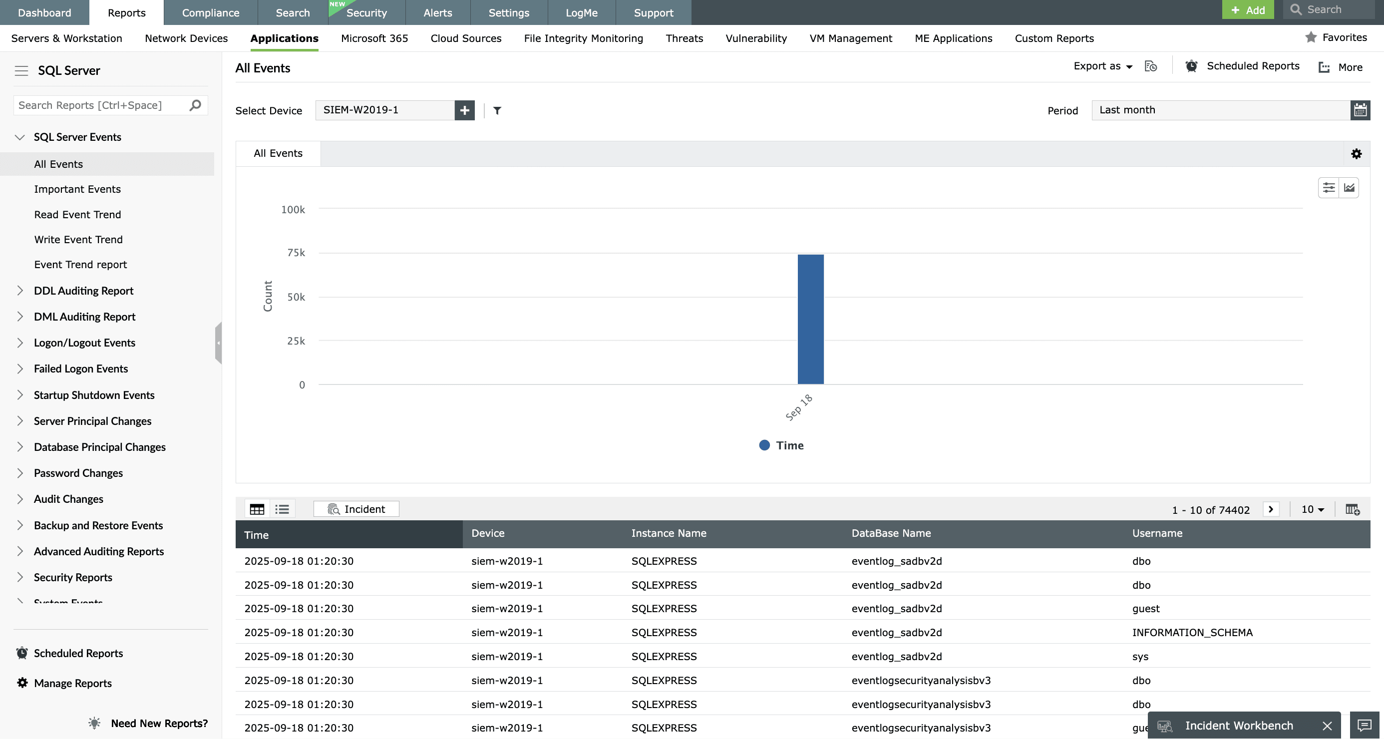 Track access to confidential information stored in database servers using EventLog Analyzer. By collecting and analyzing logs from database servers such as Microsoft SQL servers, Oracle servers, and MySQL servers, EventLog Analyzer generates comprehensive reports that can help you monitor database activities such as logons, DDL and DML queries executed on the database, password modifications, permission changes, privilege escalations, role changes, and more. Get alerted instantly when any suspicious activity occurs in your database server.