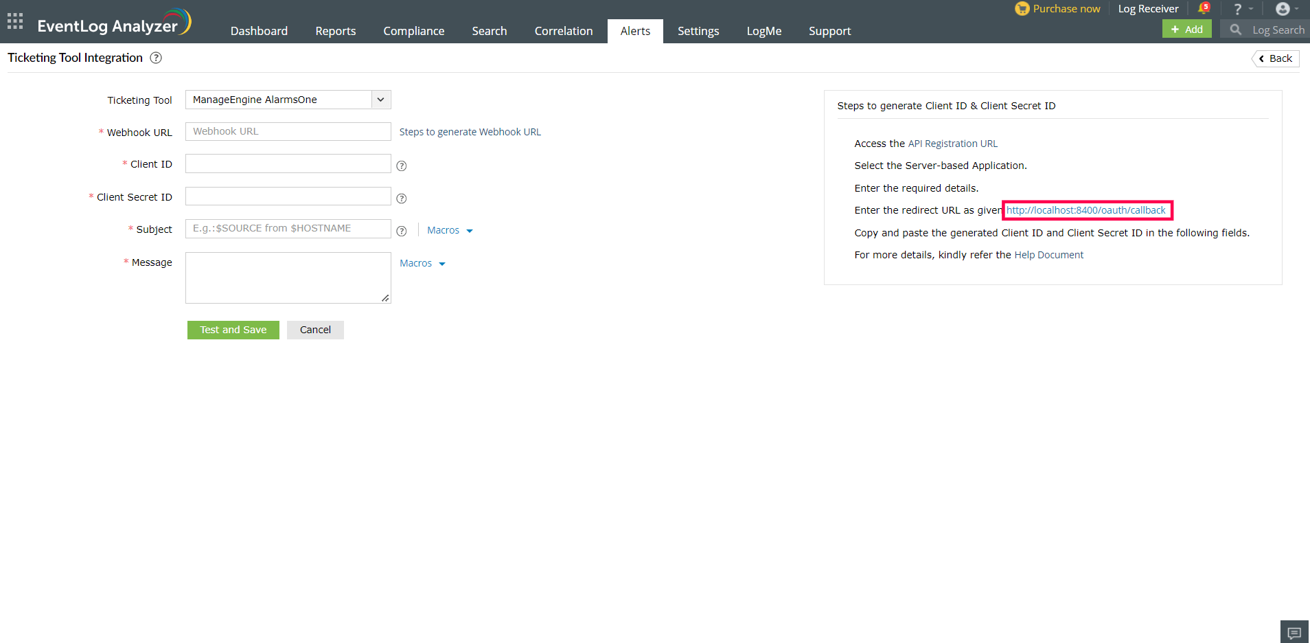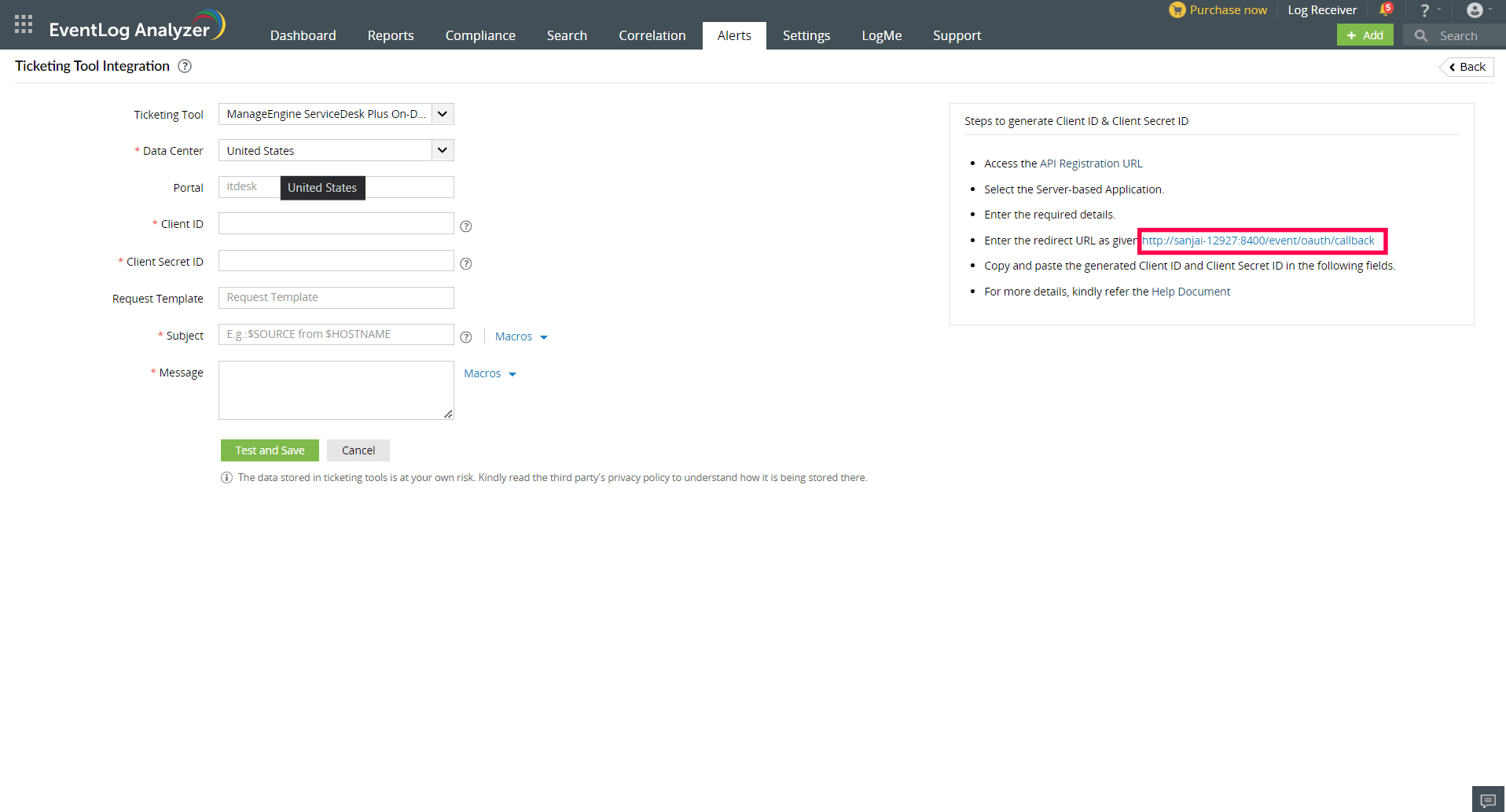 Configuration in EventLog Analyzer for Zendesk integration: