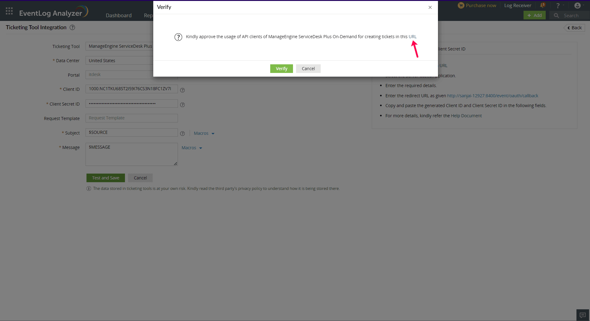 - Click the Verify button in EventLog Analyzer console. The ticketing tool will now be configured successfully.
