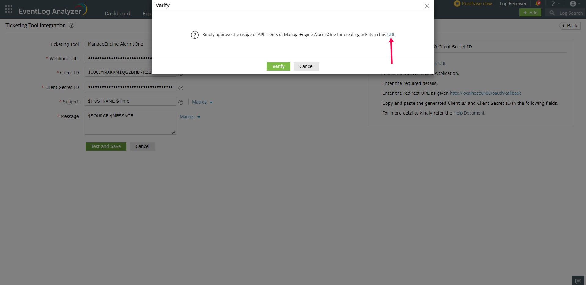 - Enter the Subject and the Message for the alert. You can select them from the predefined list available under Macros or type your own. Click the Test and Save button. On clicking the Test and Save button, a verify popup will be displayed. Click the URL to approve the usage of the clients of ManageEngine AlarmsOne.