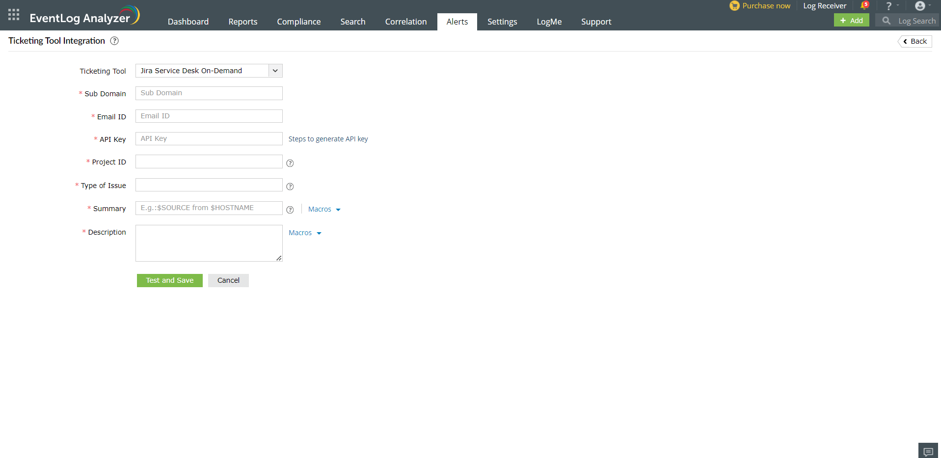 In EventLog Analyzer, navigate to the Alerts tab and click Ticketing Tool Integration under Alert Configuration. From the Ticketing Tool drop-down list, select Jira Service Desk On-Demand.