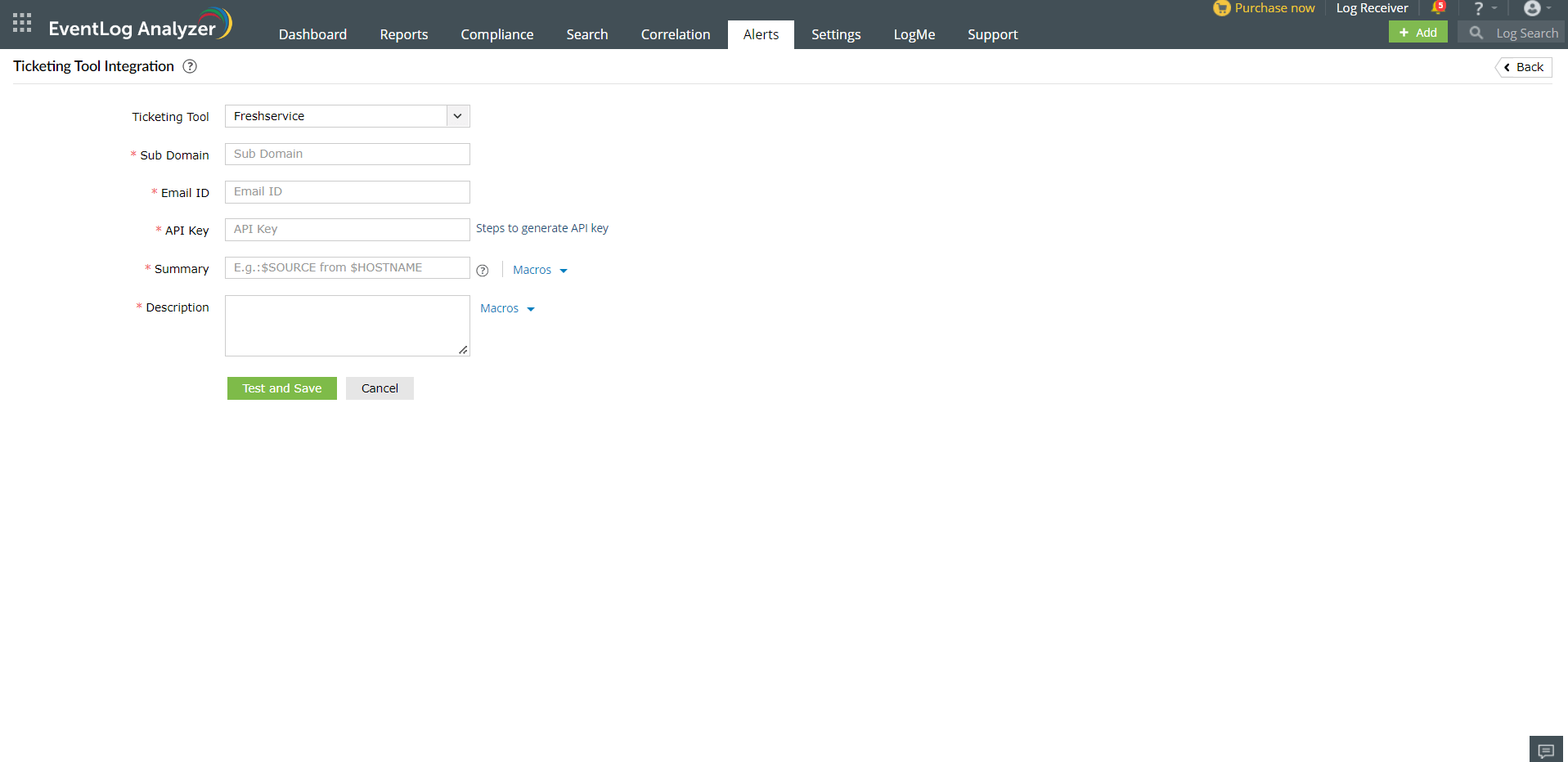 In EventLog Analyzer, navigate to the Alerts tab and click Ticketing Tool Integration under Alert Configuration. From the Ticketing Tool drop-down list, select Freshservice.