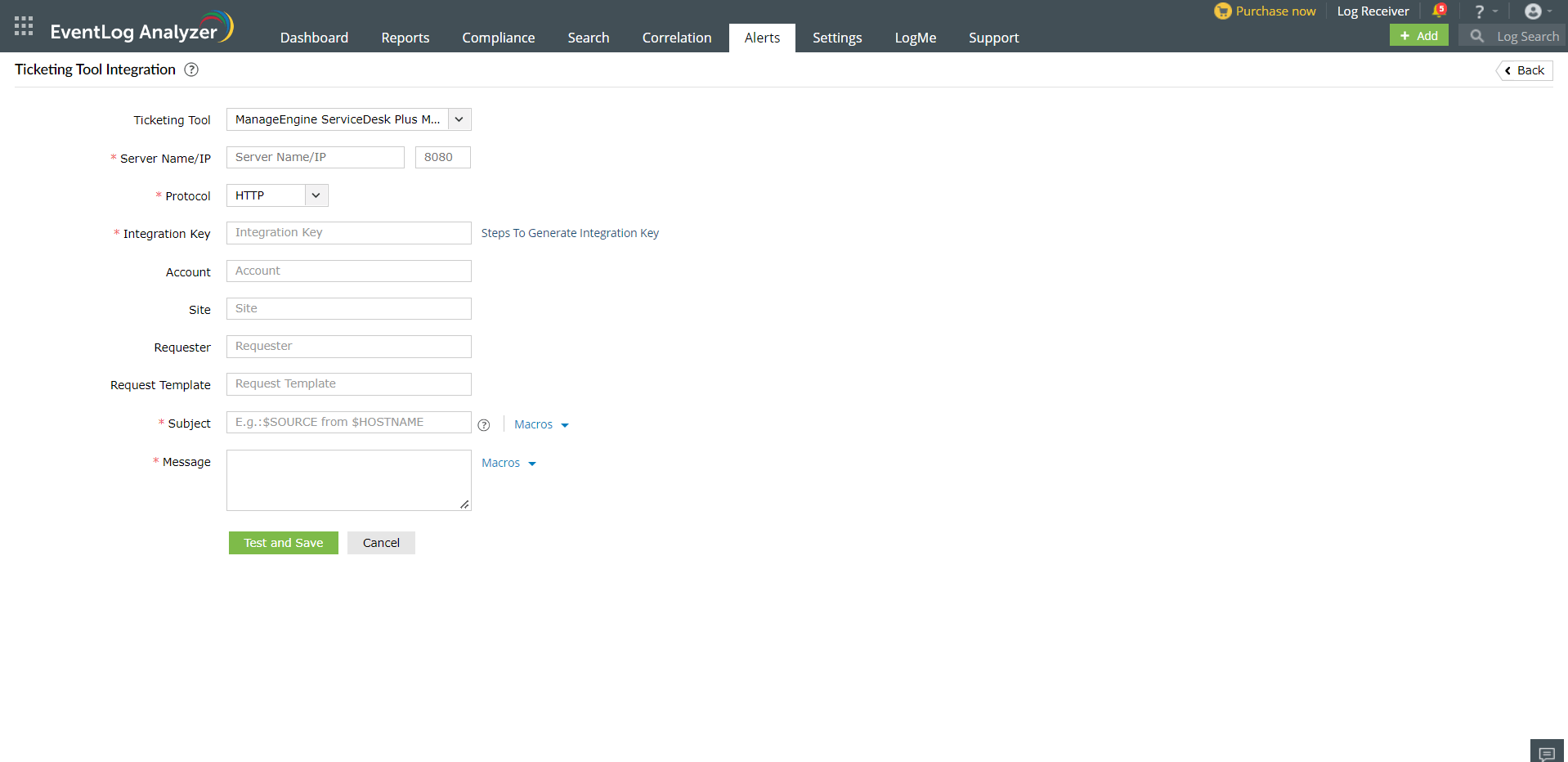 In EventLog Analyzer, navigate to the Alerts tab and click Ticketing Tool Integration under Alert Configuration. From the Ticketing Tool drop-down list, select ManageEngine ServiceDesk Plus.
