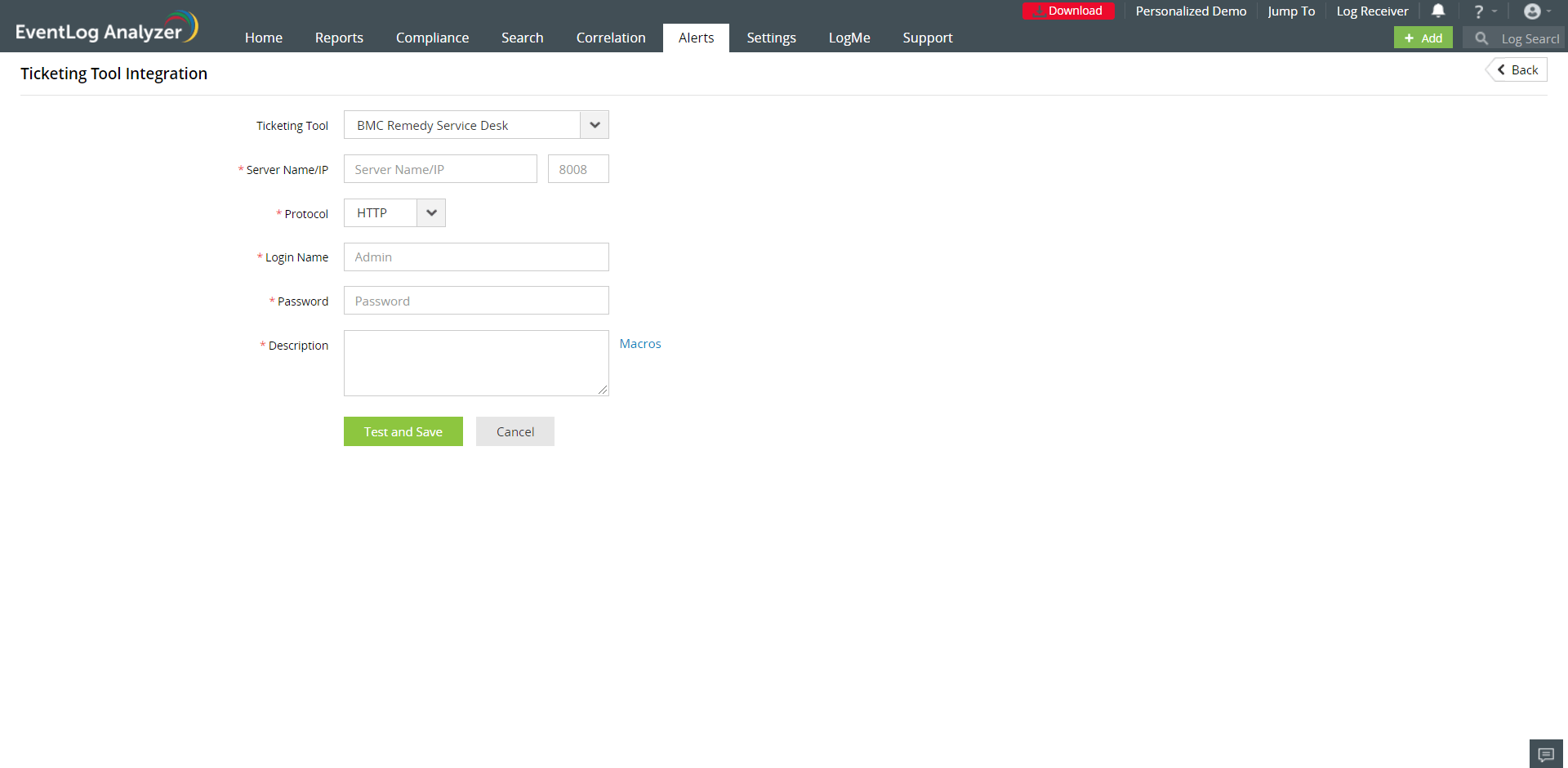 In EventLog Analyzer, navigate to the Alerts tab and click on ticketing tool integration under Alert Configuration. From the Ticketing Tool drop-down list, select BMC Remedy Service Desk.