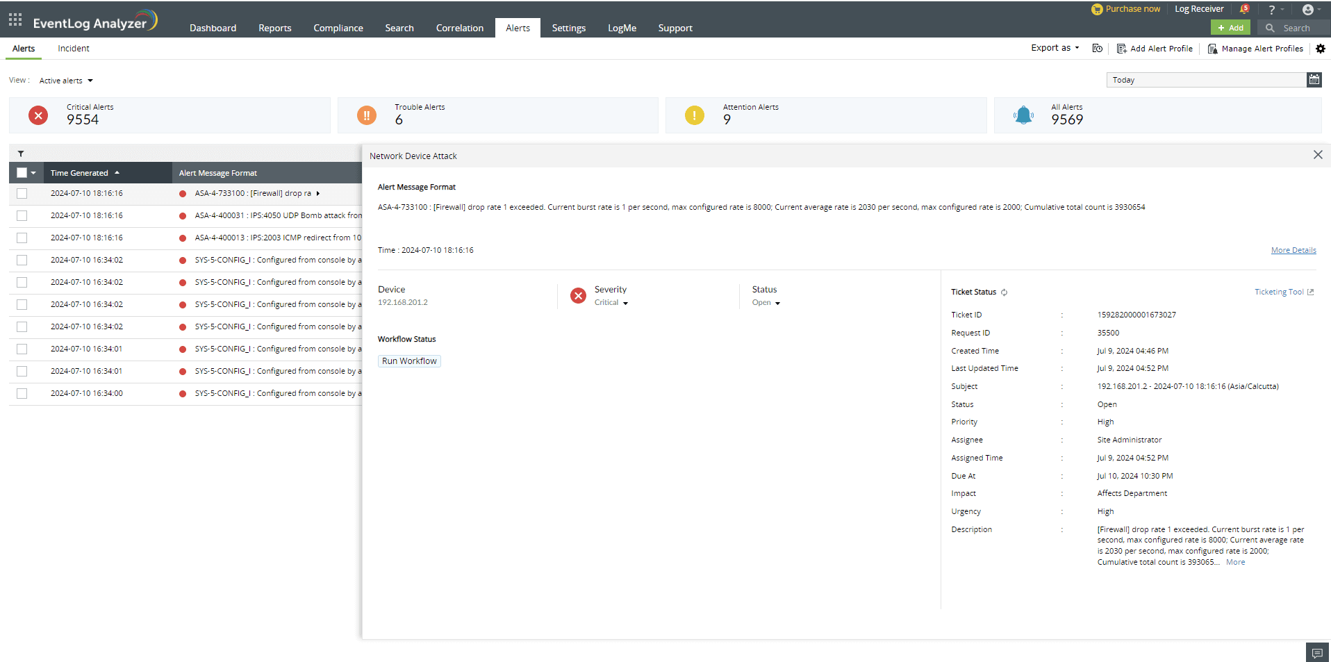 With EventLog Analyzer, you can efficiently manage security incidents by raising tickets and assigning them to administrators for alerts that are generated. After successfully configuring the ticketing tool, the ticket details can be viewed in Alerts tab by clicking the specific alert.