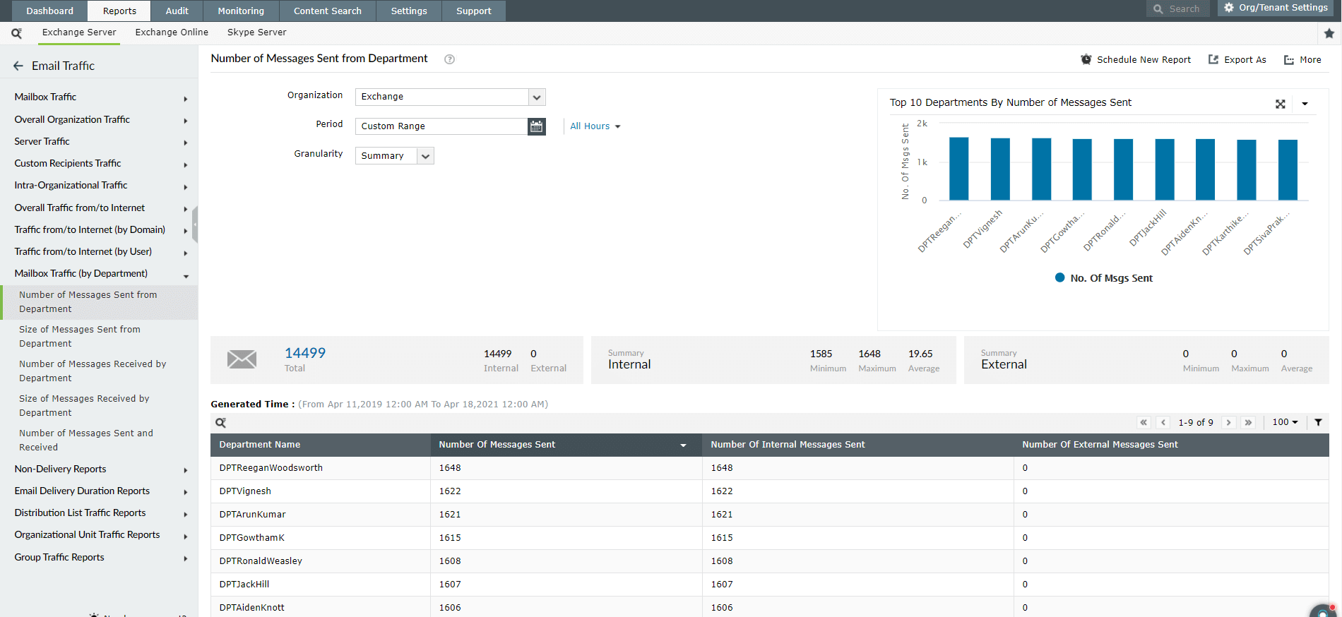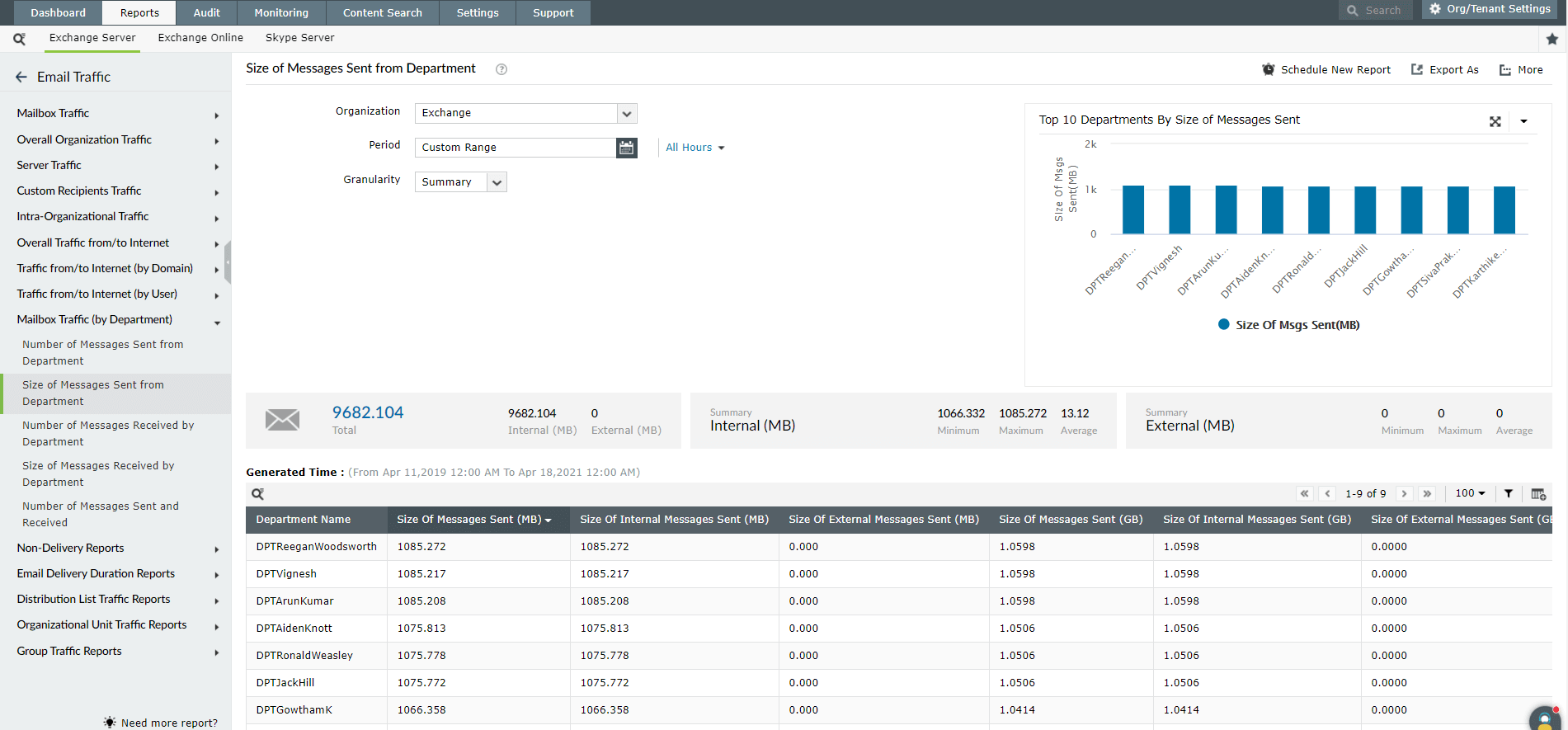 ManageEngine Exchange Reporter Plus tracks these emails and helps Exchange professionals get granular numbers that aid in-depth analysis of a department’s communication trends. Exchange Mailbox Traffic (by Department) provides size- and count-related data on email communications for each department. The reports under this category include the following: