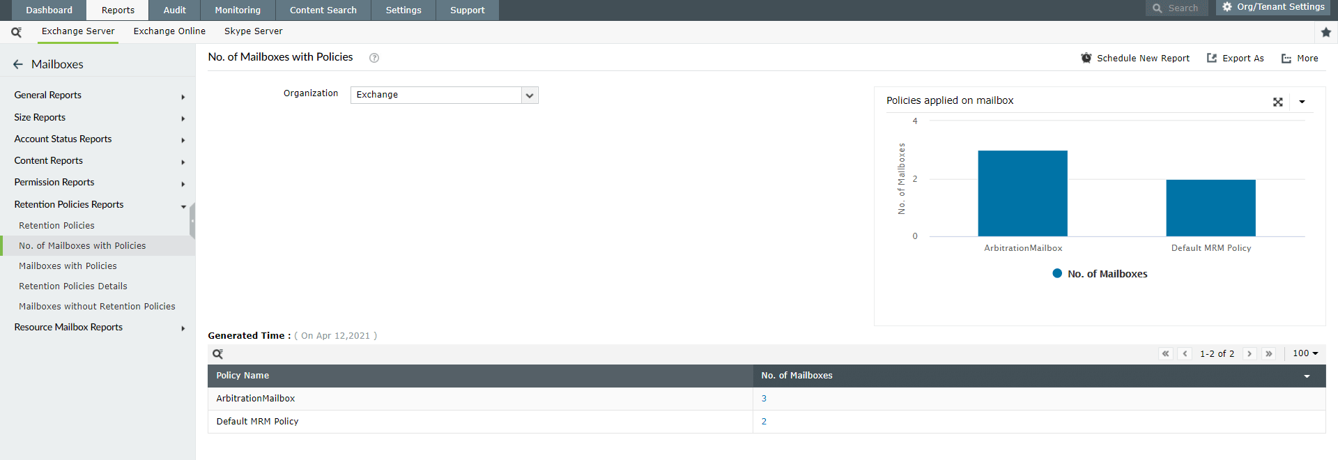 You can use the No. of mailboxes with policies report to get an overview of how many mailboxes are associated with each retention policy. This report shows the number of mailboxes under each policy and includes a visual bar graph for easy comparison, helping you track the application of retention policies across your organization.