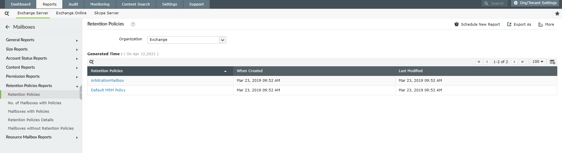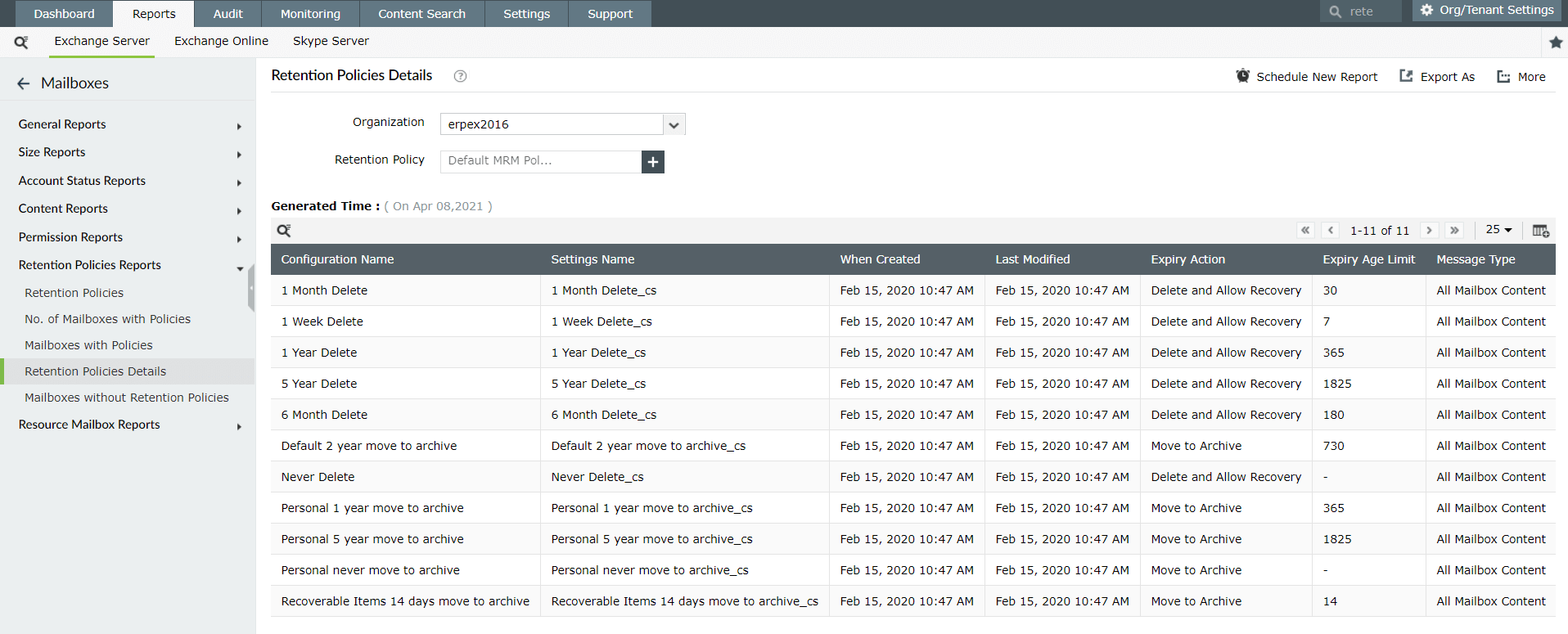 This report provides an overview of all retention policies applied within your Exchange environment. It displays details such as the creation date, the last modification date, and the canonical name of each retention policy. This report helps you track the life cycle of retention policies, ensuring that policies are up to date. By reviewing this report, you can make informed decisions about policy modifications.