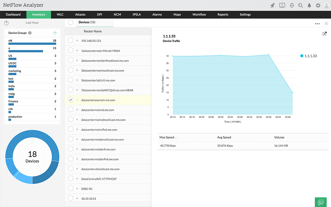 Quick Details on Devices Monitored with Device Summary details based on categories like Routers, Switches, Firewalls and WLC. You can get to the Device details view by directly cliking on any device.