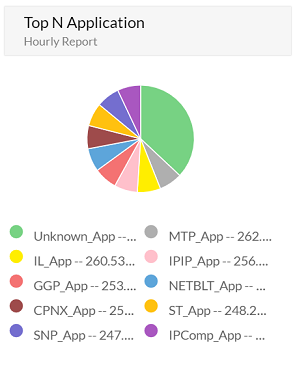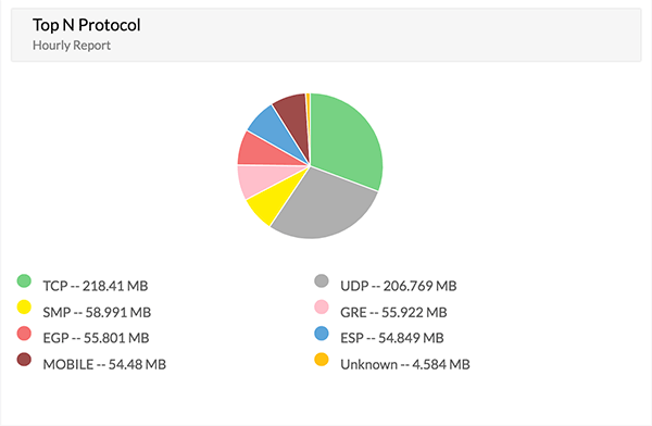 The table gives a glance about the top 10 Protocol and its utilization based on the Device, Interfaces, Interface Groups or IPGroups. By default the widget will show the top Protocols based information from all the devices monitored in NetFlow Analyzer.