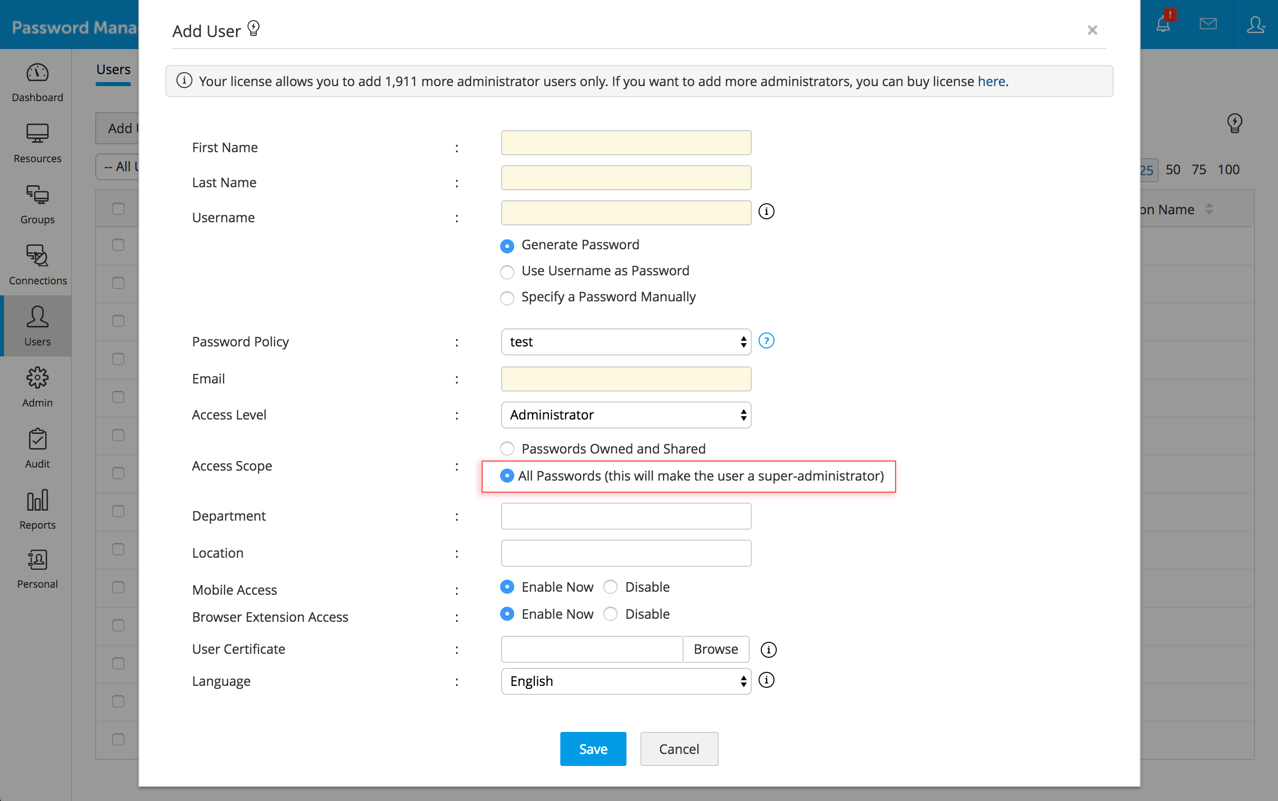 Since super admin accounts are very sensitive in nature, with complete access privileges to all stored data in Password Manager Pro, creating the account is optional. If you choose to have a super admin account in your environment, the account can only be created after two of your IT administrators approve the process in Password Manager Pro.