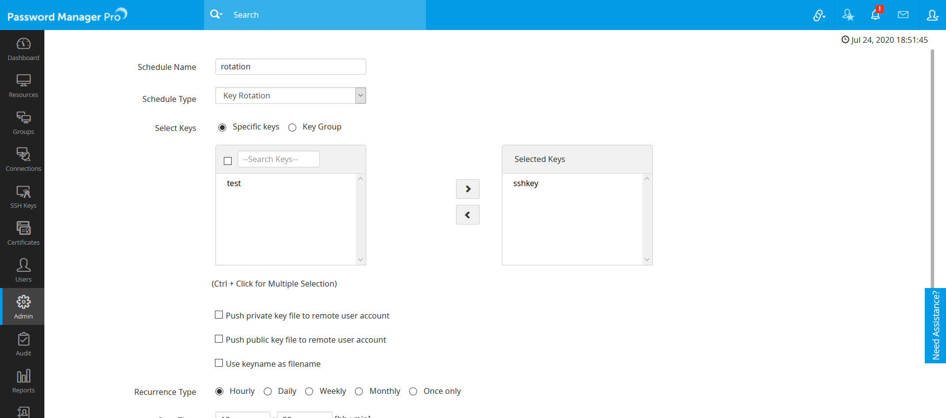 - Key Rotation - Schedule the rotation of SSH keys assigned to user accounts. Select the keys that are to be scheduled for rotation. If keys are not assigned but are scheduled to rotate, schedule rotation will fail and an error message will be displayed in the Schedule audit and the Audit tabs in the GUI. Also, you can automatically push the key files (private key, public key or both the private and public keys) onto its associated users by enabling the 'push key to user' option available in this page, instead of pushing the key files manually after every scheduled rotation.