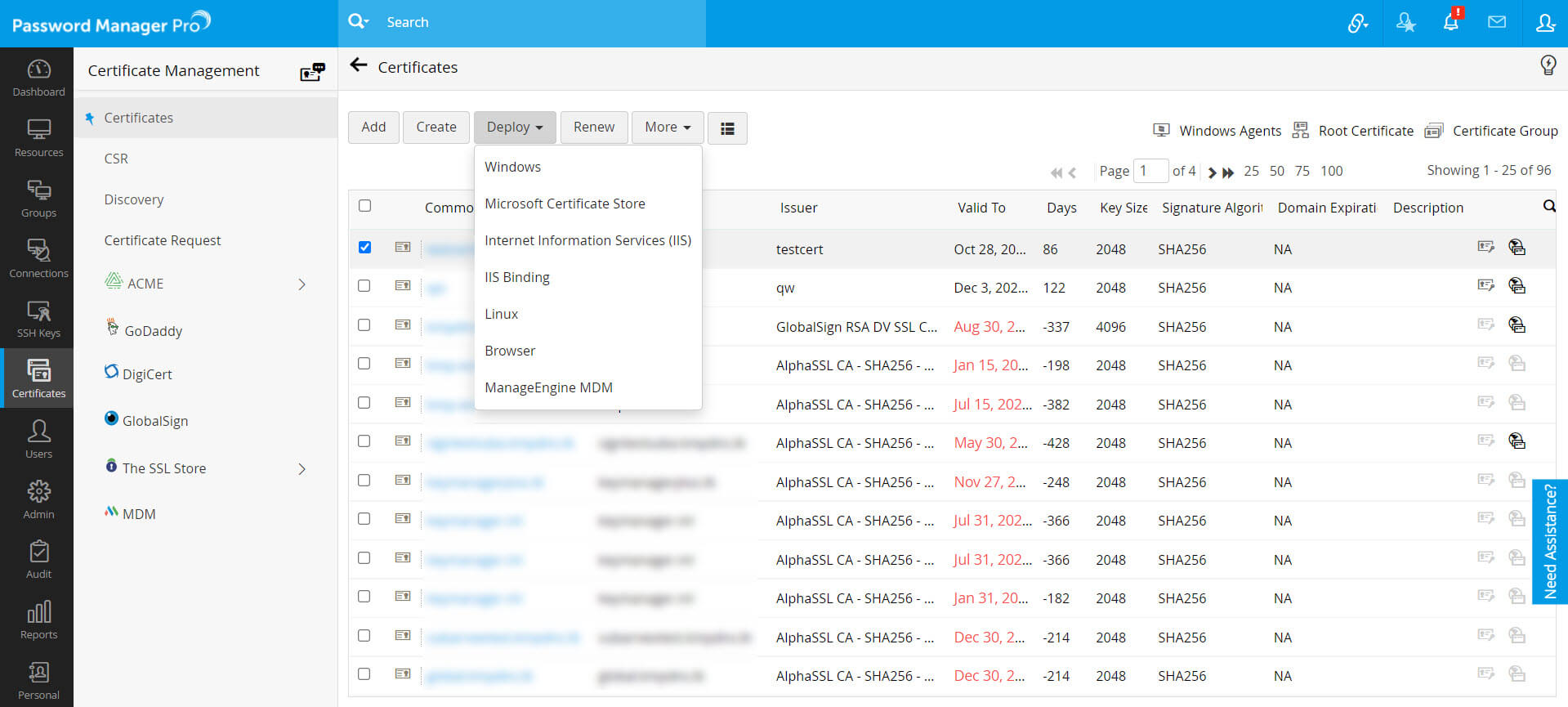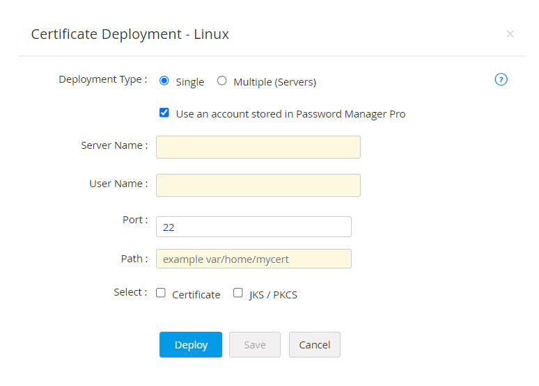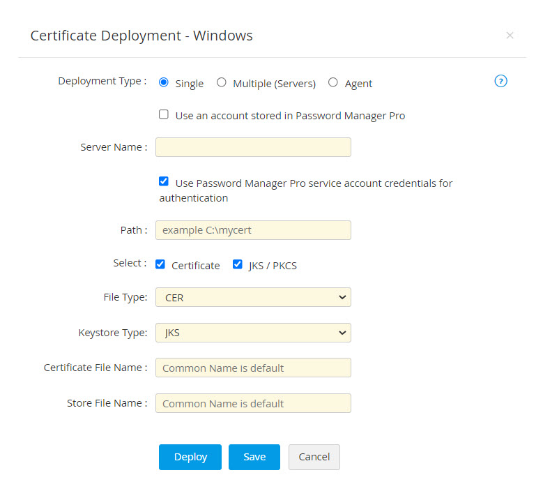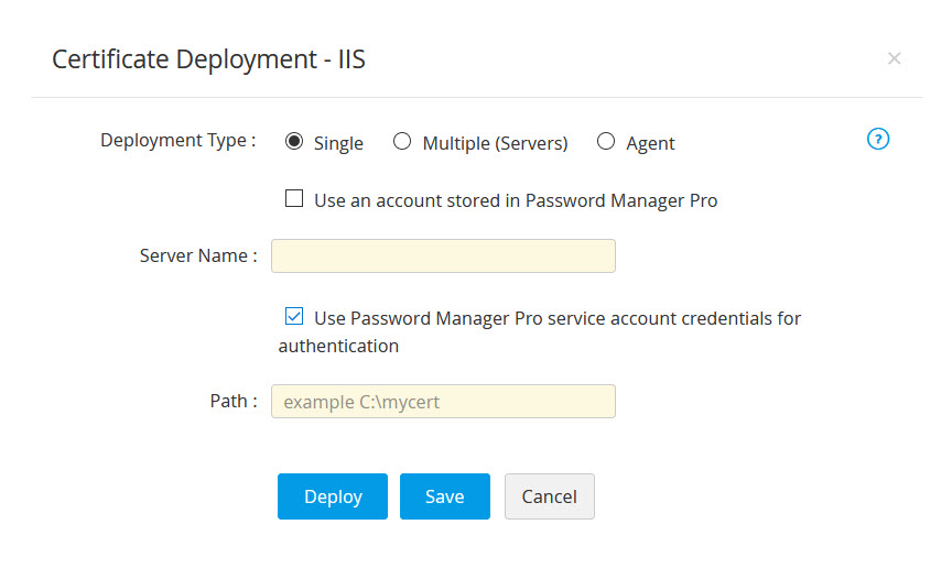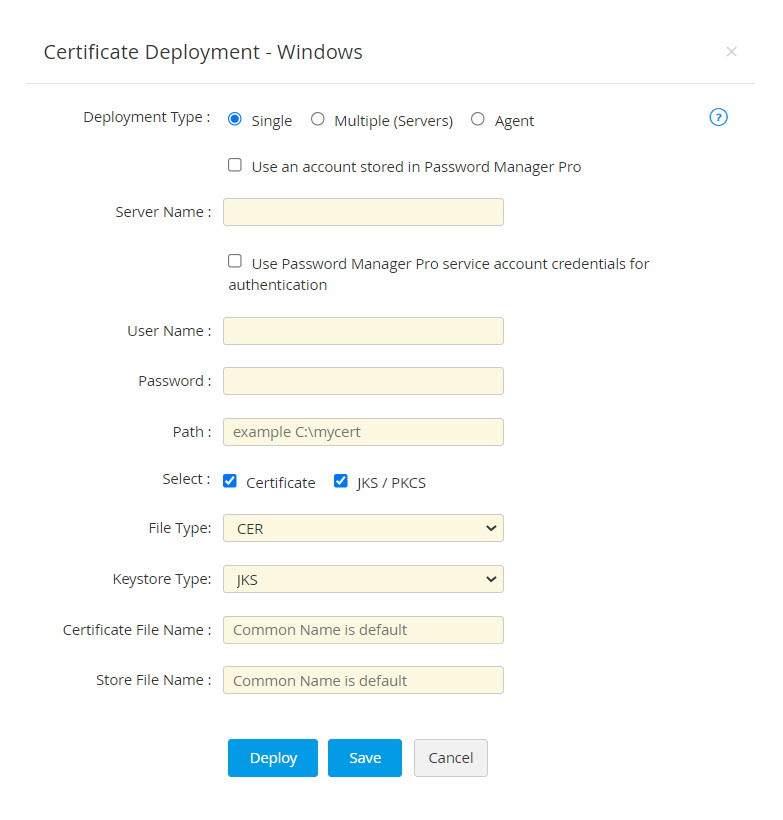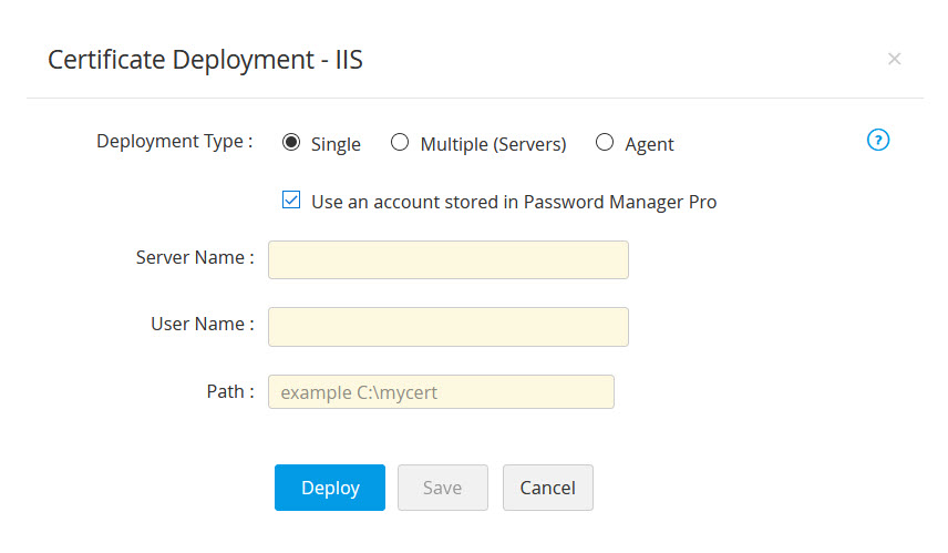In general, SSL certificates procured from Certificate Authorities (CAs) are stored in a repository and then manually deployed on appropriate target systems. Password Manager Pro deploys the certificates from the repository on the correct target systems automatically. You can use Password Manager Pro to deploy the certificates on the various systems individually, or in bulk, based on your requirements. Also, you can use the Key Manager Plus agent to deploy certificates on servers that reside in demilitarized zones outside of the domain where the Password Manager Pro server is present.
