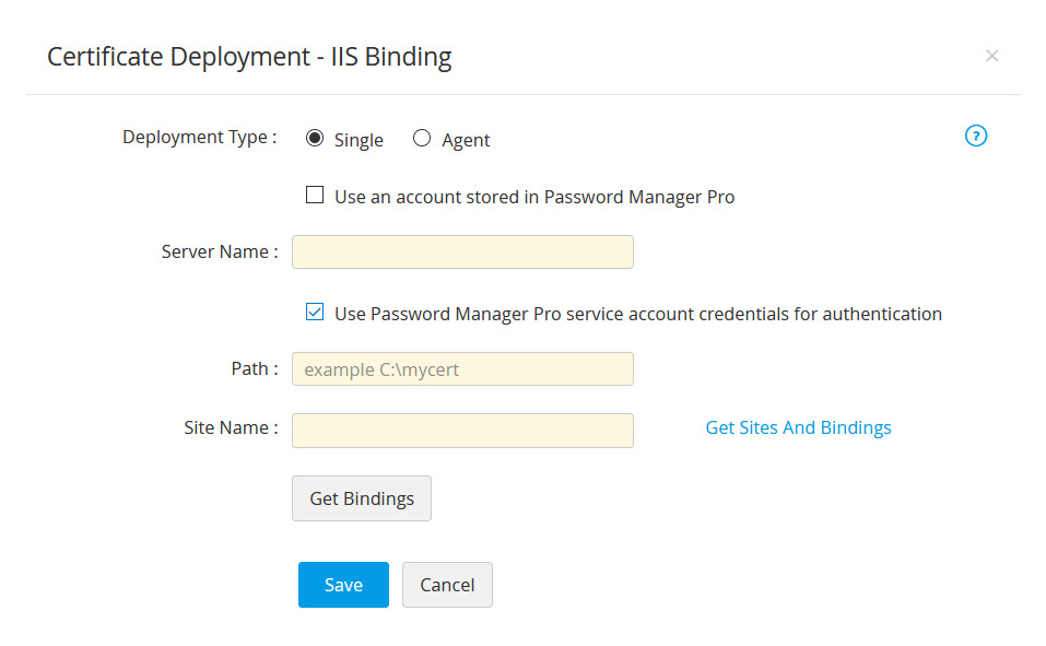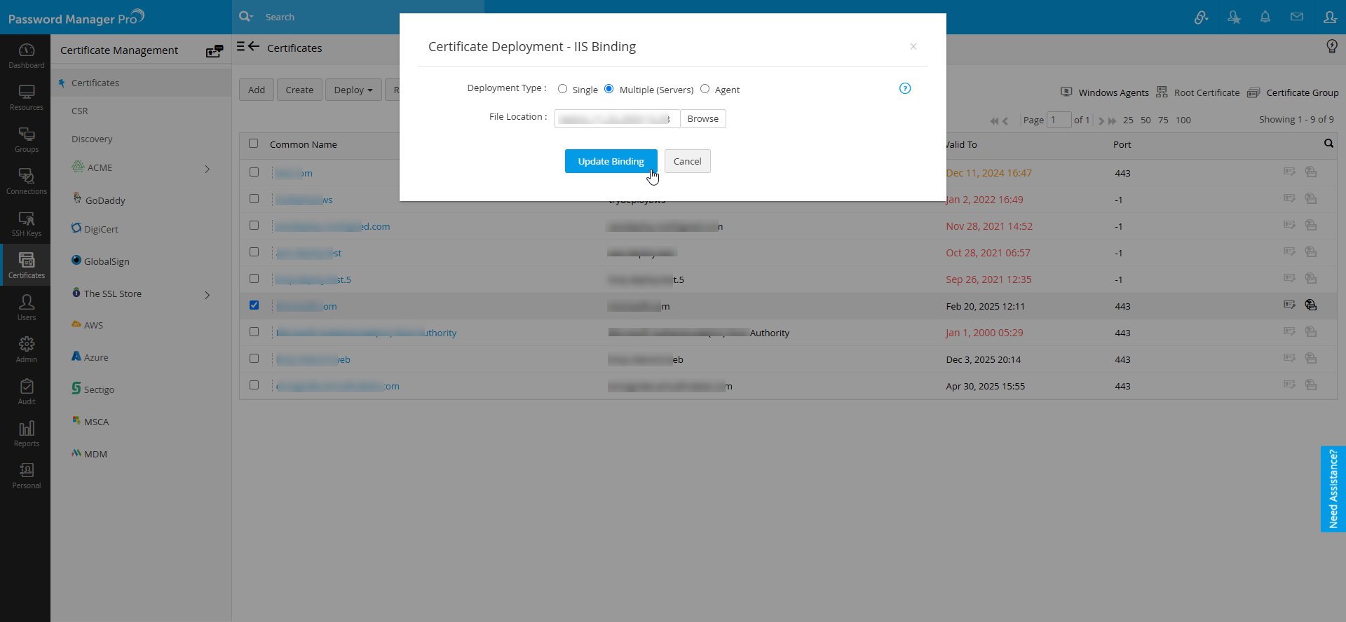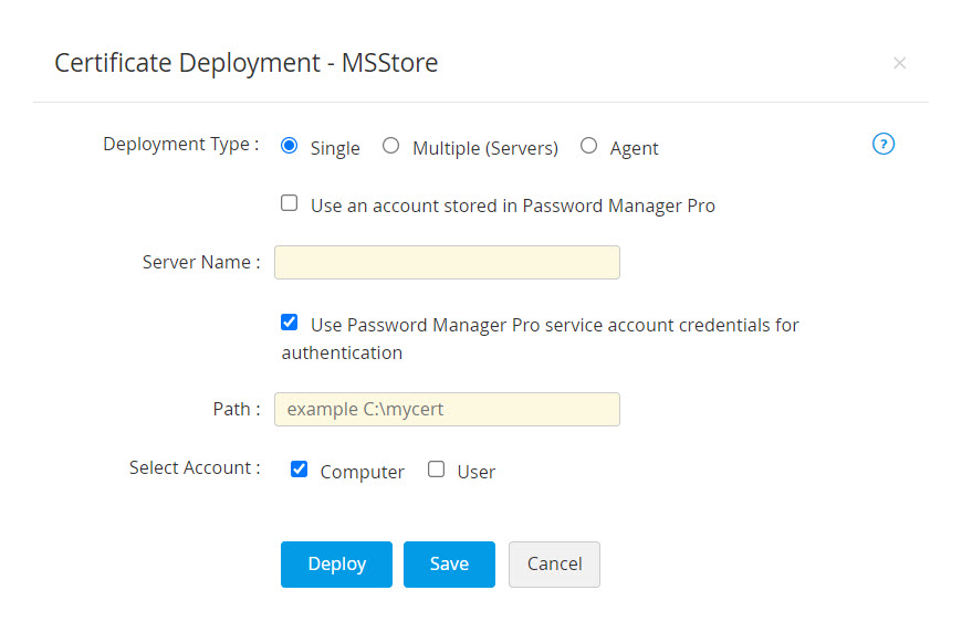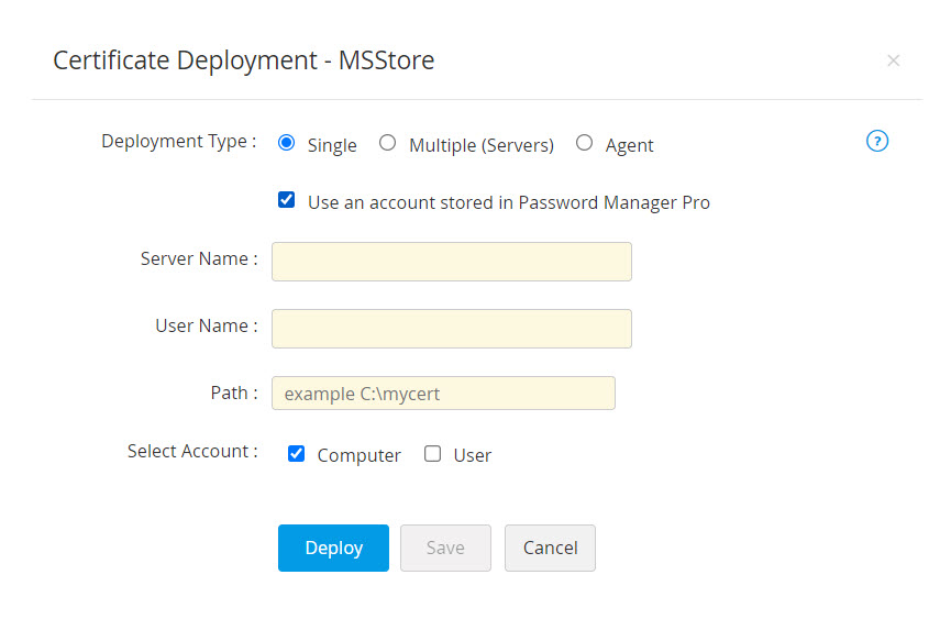 In general, SSL certificates procured from Certificate Authorities (CAs) are stored in a repository and then manually deployed on appropriate target systems. Password Manager Pro deploys the certificates from the repository on the correct target systems automatically. You can use Password Manager Pro to deploy the certificates on the various systems individually, or in bulk, based on your requirements. Also, you can use the Key Manager Plus agent to deploy certificates on servers that reside in demilitarized zones outside of the domain where the Password Manager Pro server is present.