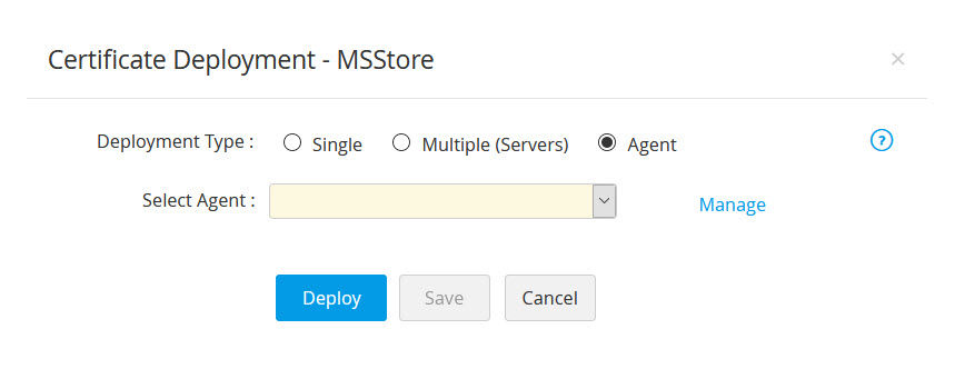 - To deploy certificates to MS Certificate store, choose the server type as Microsoft Certificate Store.