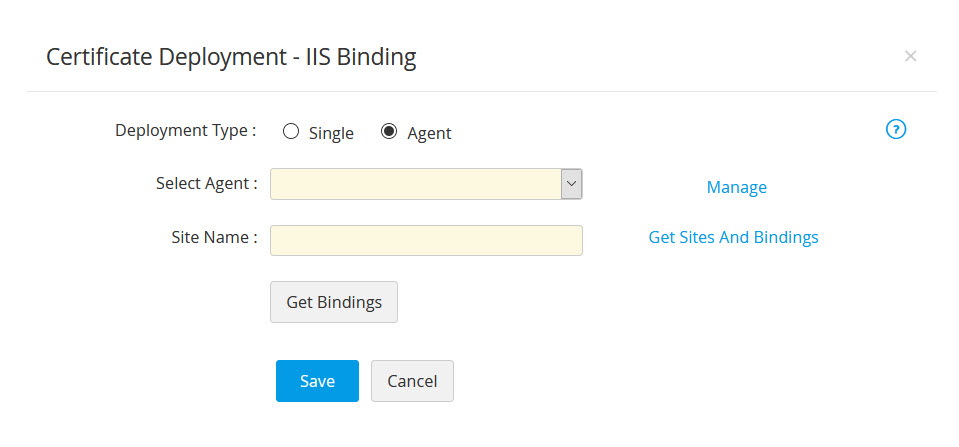 - If the IIS Server resides in a demilitarized zone, choose the Deployment Type as Agent. Select an agent from the drop-down. Click Get Sites And Bindings to list all sites and their respective bindings available in the selected server. Enter the name of a site in the Site Name field, click Get Bindings to list all the bindings available for that site.