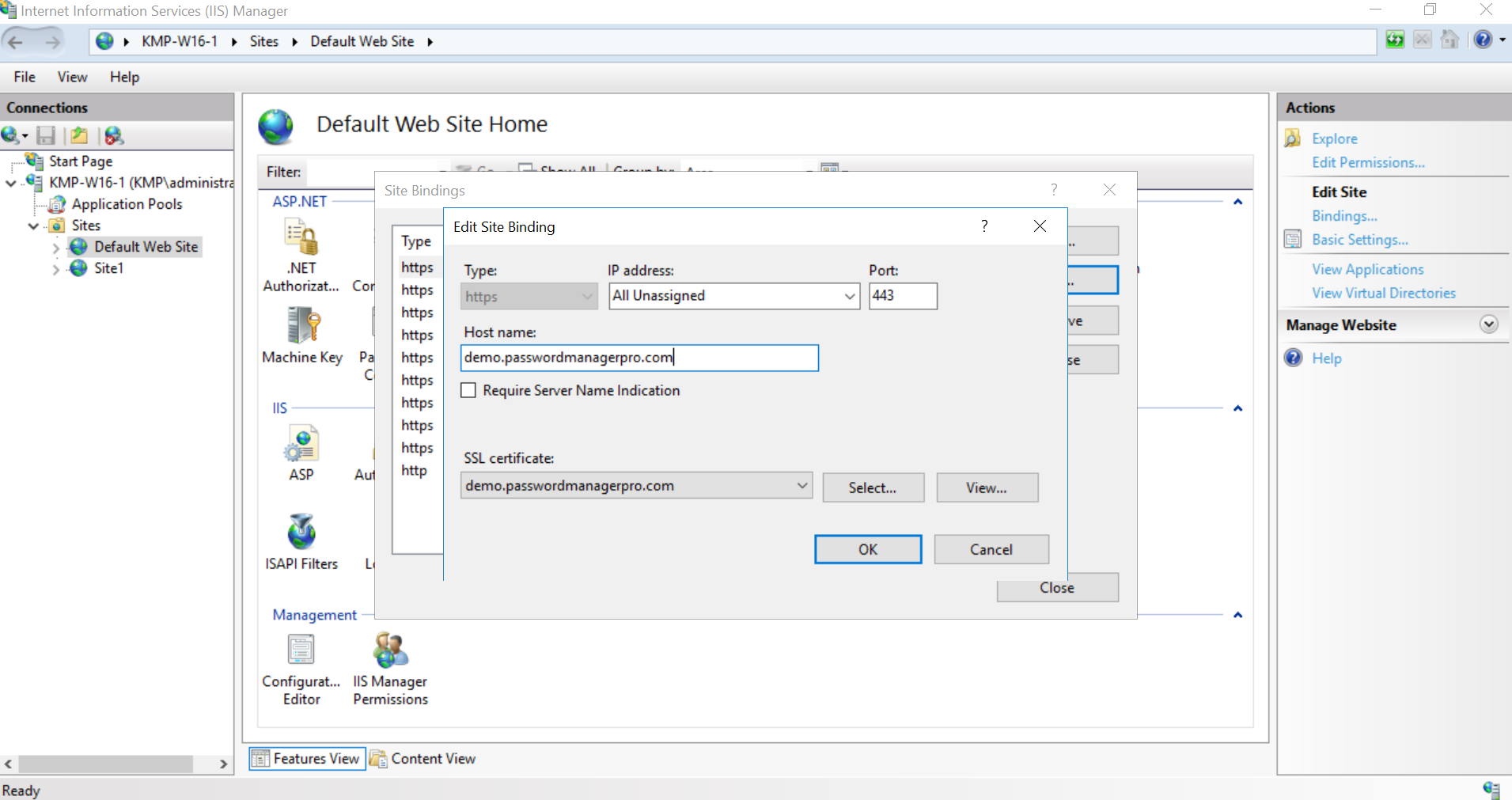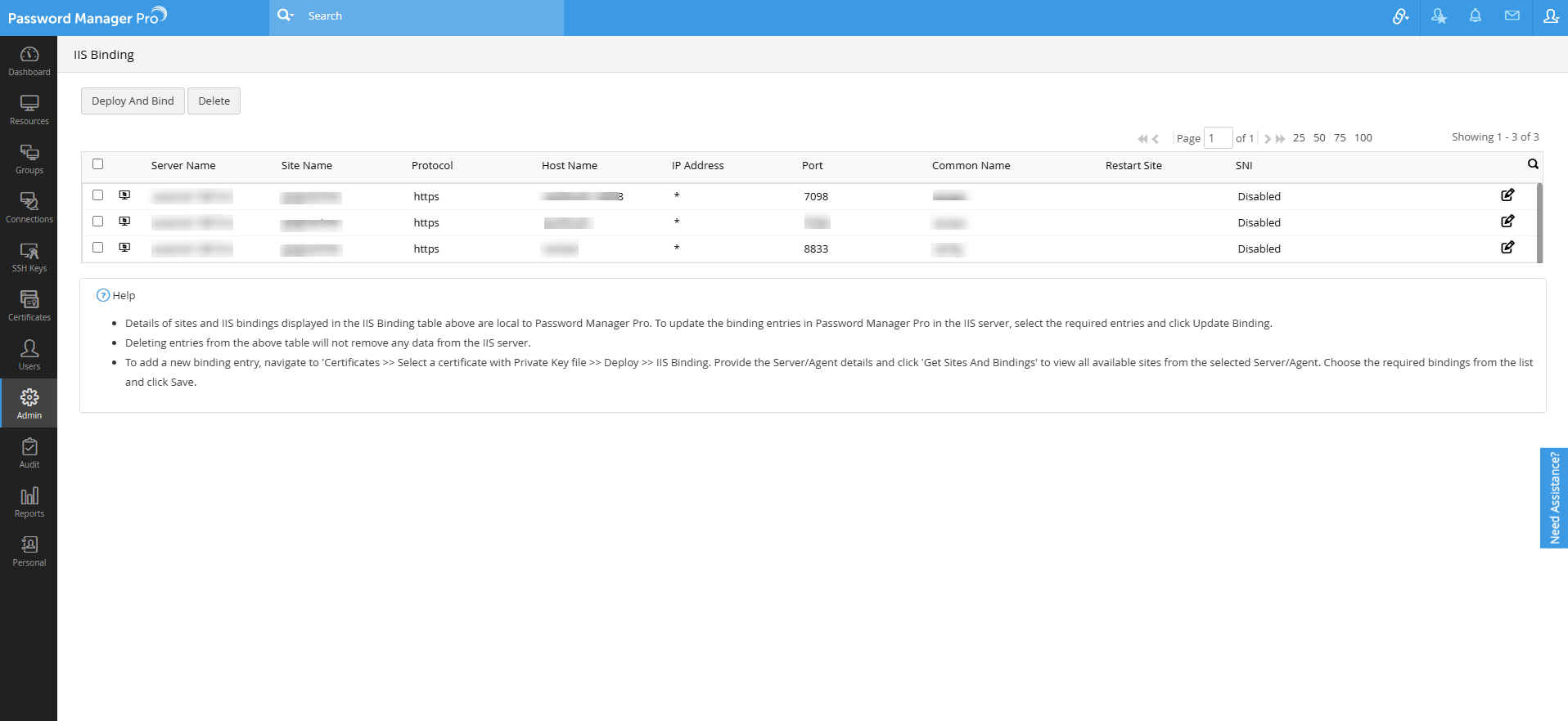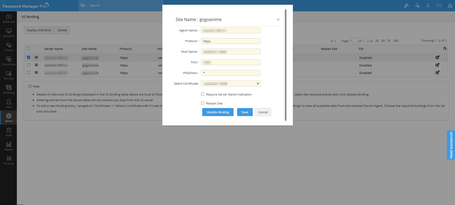 - Here, to add new bindings, click Add New Bindings and enter attributes such as Host Name, Port, IP Address, and select a certificate. Select the checkbox to Require Server Name Indication while configuring and updating IIS Binding. The newly added bindings will be visible under Admin >> SSL Certificates >> IIS Binding. The new site bindings added in Password Manager Pro will not reflect in the IIS server until they are deployed to the server using the Deploy and Bind option.