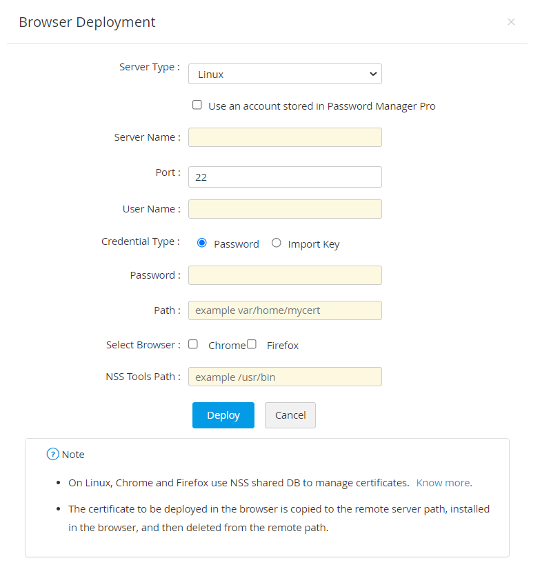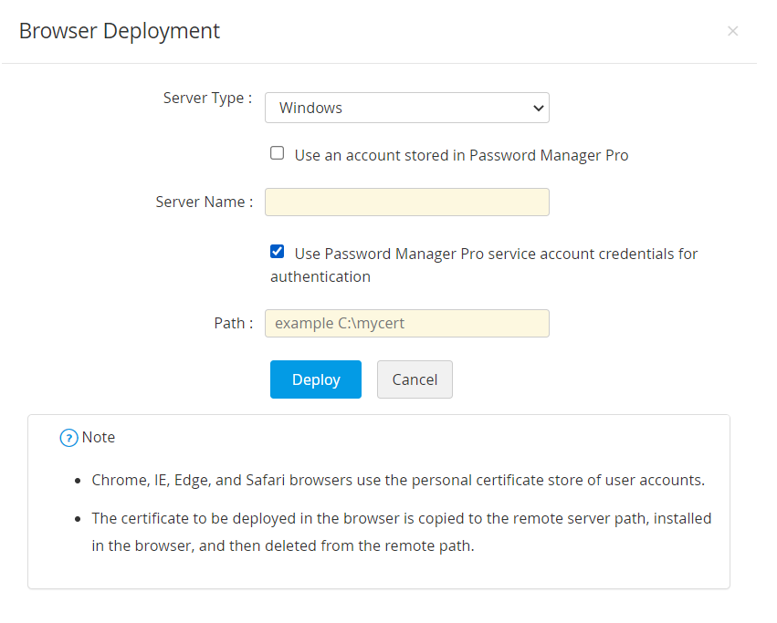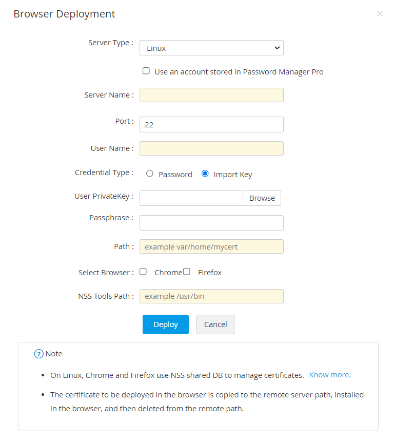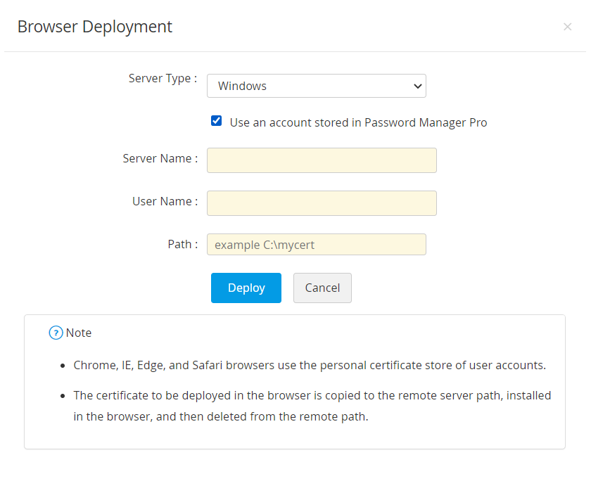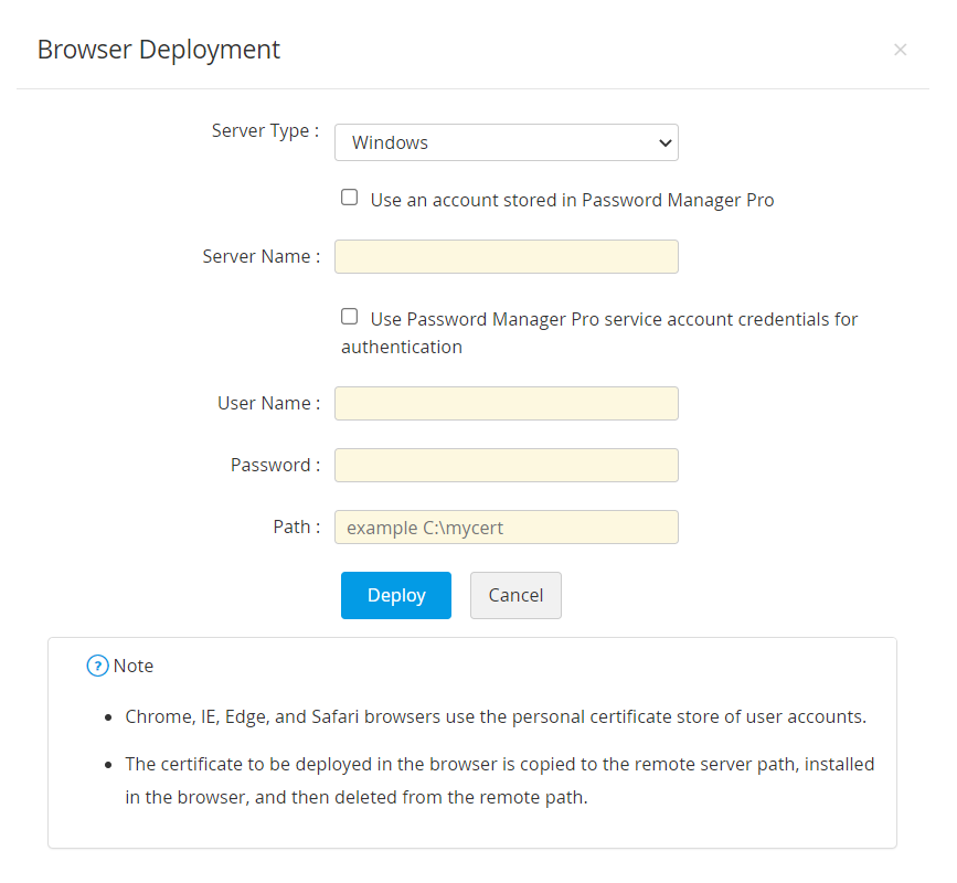 - To deploy certificates on a browser, choose the deploy type as Browser.