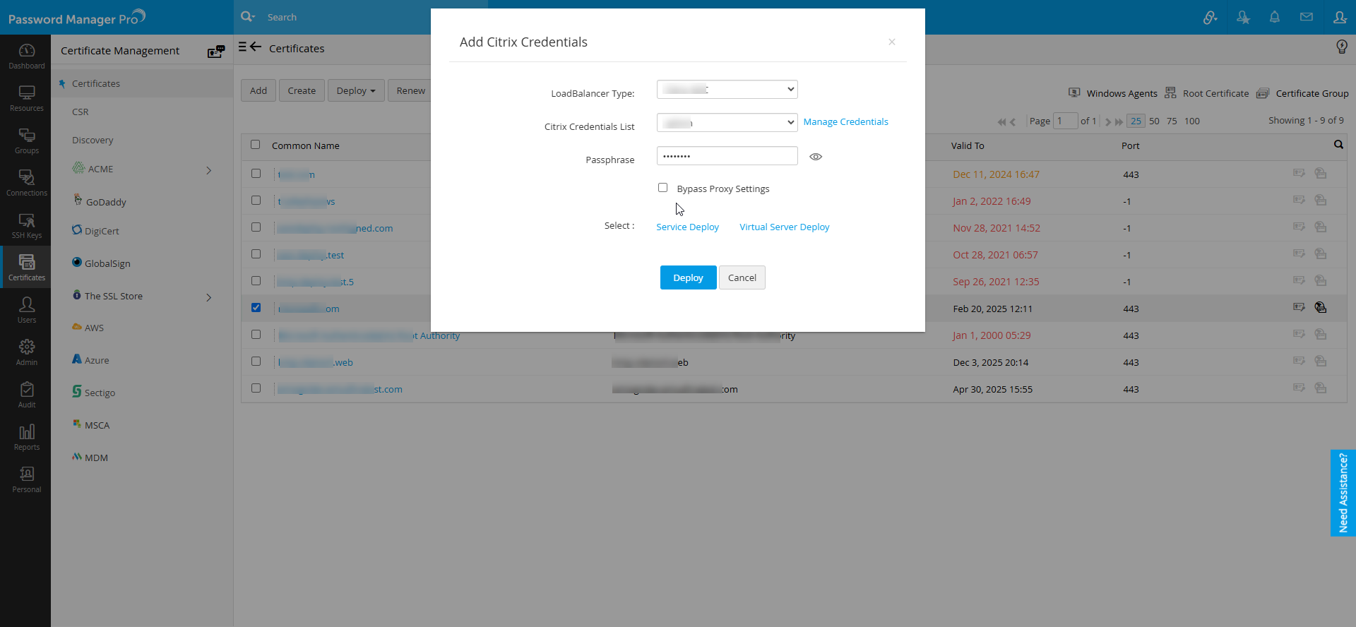Using Password Manager Pro, you can directly deploy selected SSL certificates onto target servers. To deploy an SSL certificate to a target server: