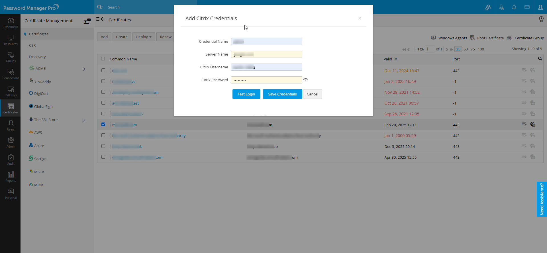 - In the pop-up that appears, click to Add and mention the Credential Name, Server Name, Citrix Username and Citrix Password.