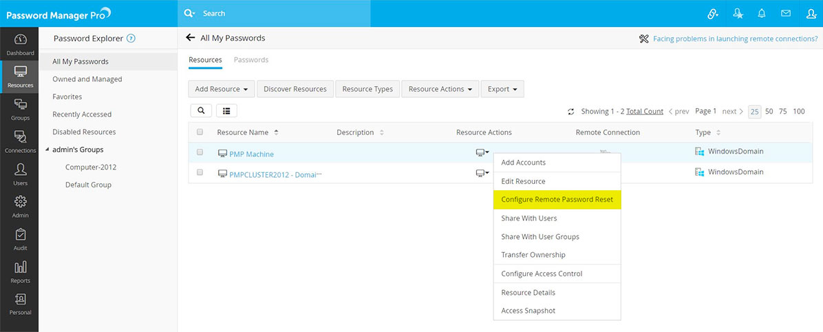 - Click the "Resource Actions" icon against the WindowsDomain 'PMP Machine' resource and select "Configure password reset" from the drop down.