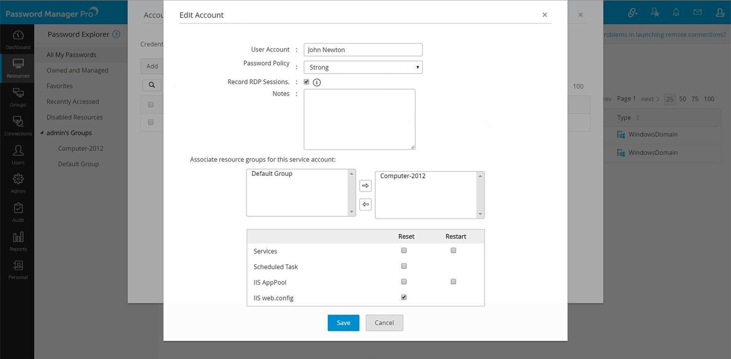 - Click "Save". Password Manager Pro will immediately reset the password in the domain first and then, automatically update the new password across all servers where 'John Newton' is used to run IIS websites.