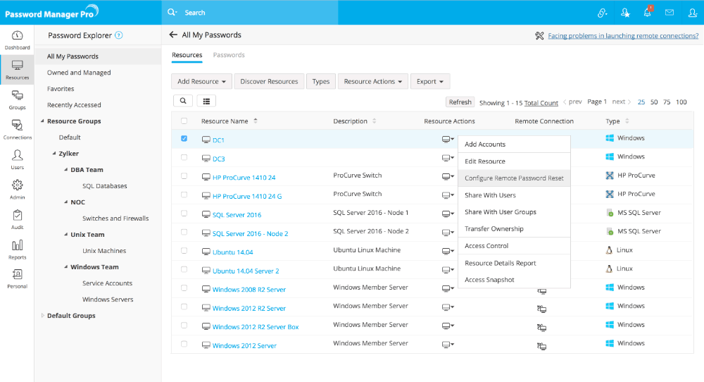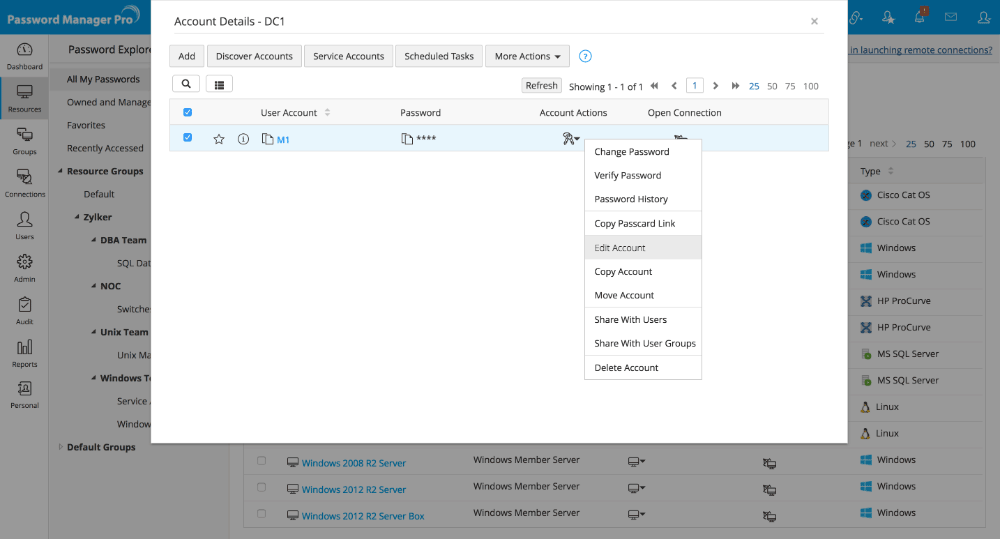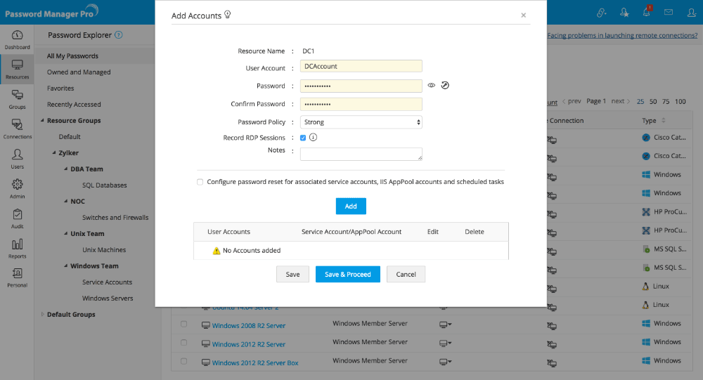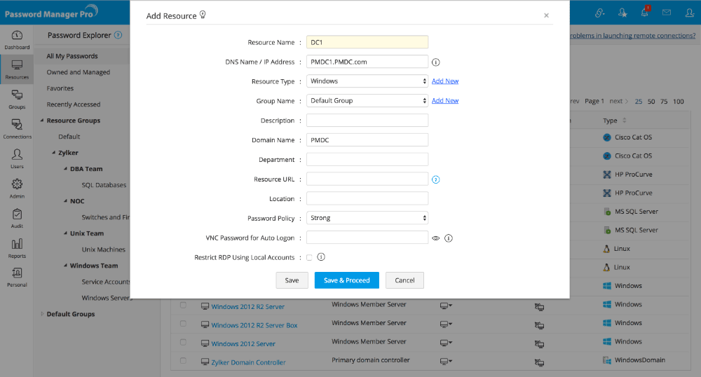 Using the above procedure, add more member servers of the domain such as Win1, Win2, Win3, and Win4 as new resources in Password Manager Pro and add their respective local accounts.