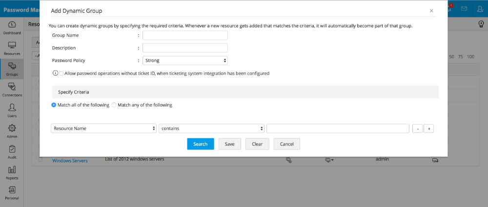 - Click Save. Dynamic Group RG1 will be created with the selected criteria. Now, whenever a resource matching to this criteria is added to Password Manager Pro, that group will automatically be added to this dynamic resource group.