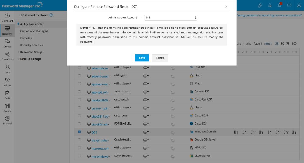 - Click Save. Remote password reset is configured and Password Manager Pro will carry out the password reset using the administrator account that was selected in the previous step.