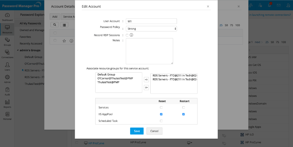 - Click Save. Password Manager Pro will immediately reset the password in the domain first and then, automatically update the new password across all servers where the App Pool account M1 is used to run App Pools.