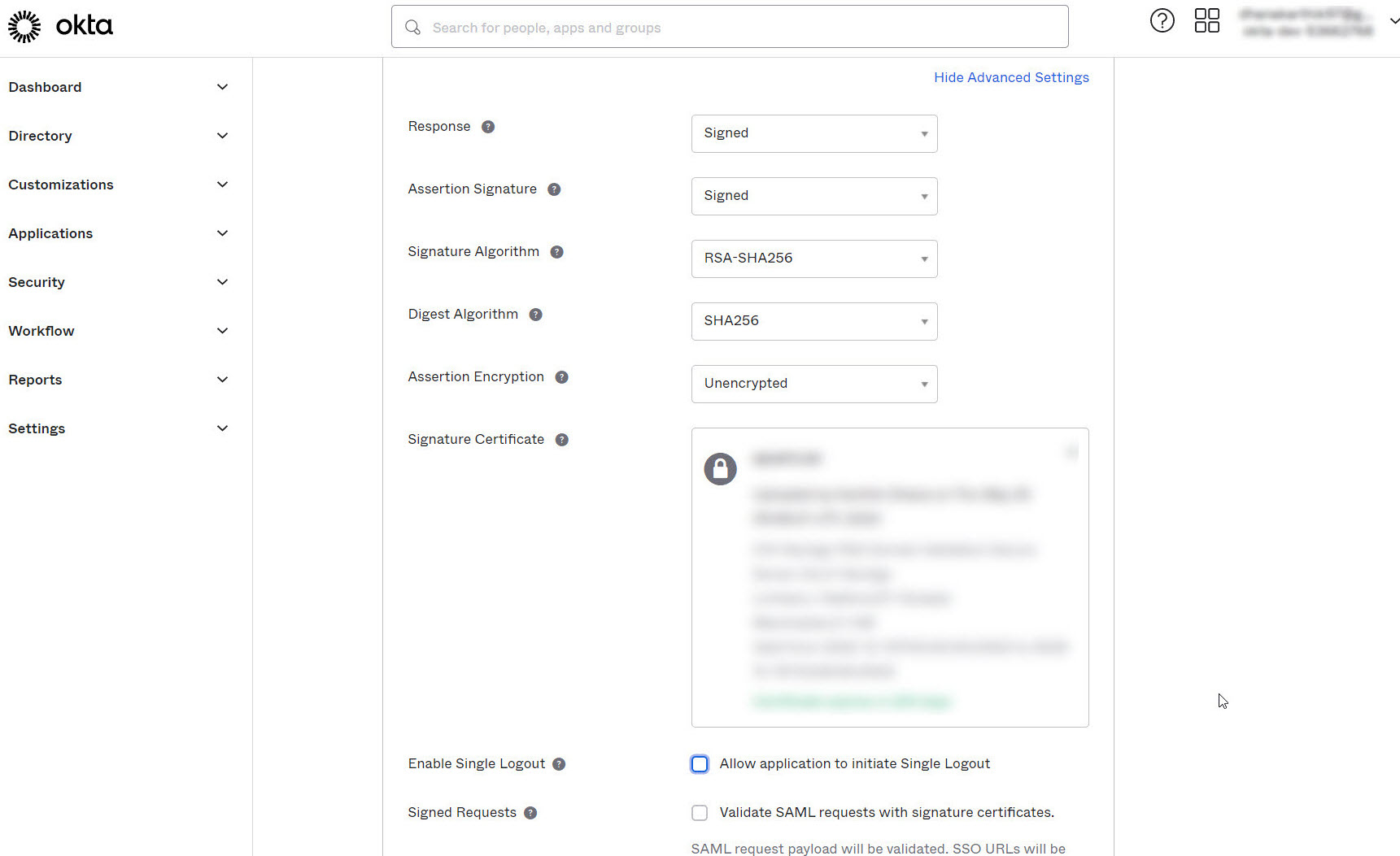 - To configure SAML Single Logout, click on Show Advanced Settings.