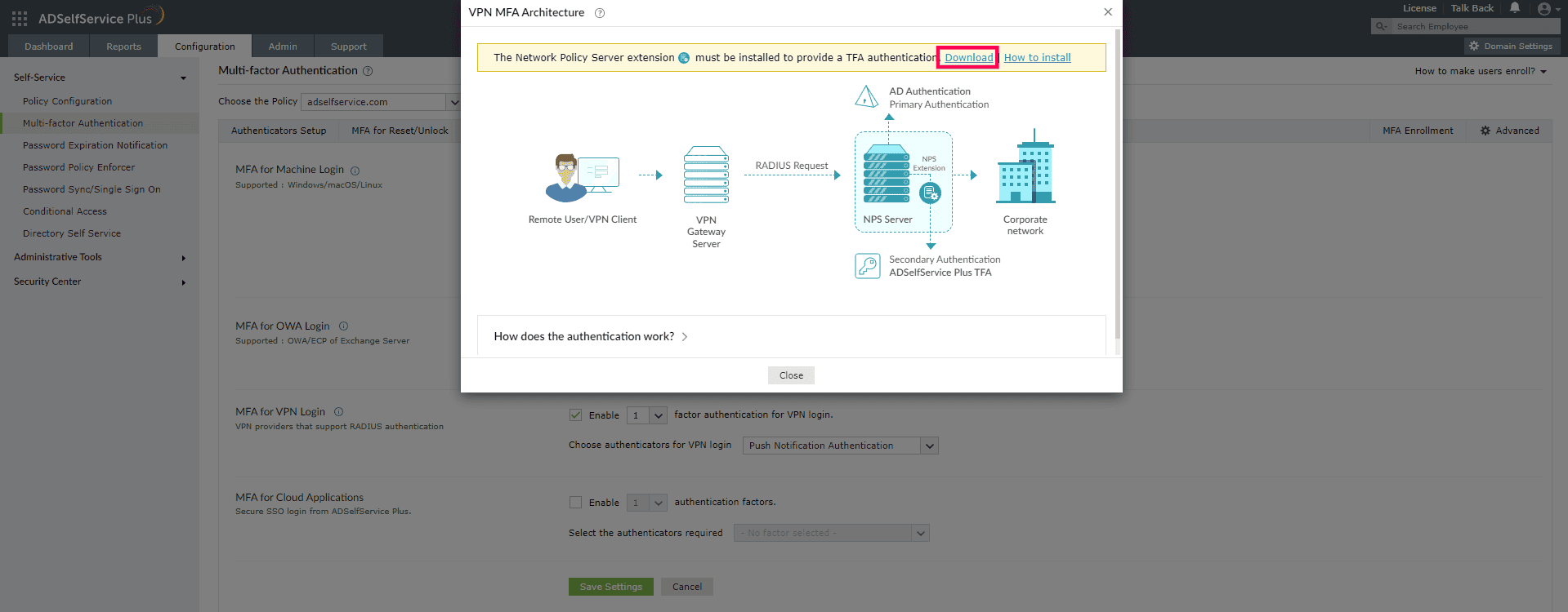 - Click the tooltip icon next to MFA for VPN Logins to display the architecture diagram and download the NPS extension using the link provided in the banner.