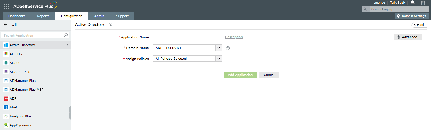 2. Navigate to the Configuration tab > Self-Service > Password Sync/Single Sign On > Add Application.
