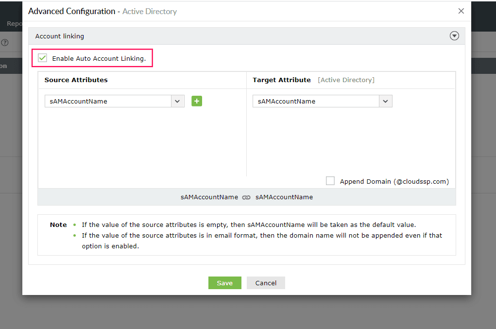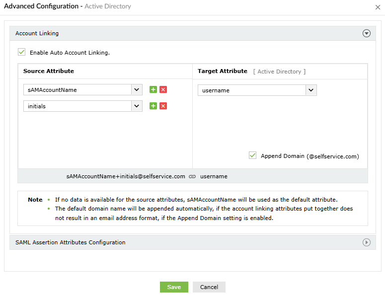• If the value of the source attributes is in an email format, then the domain name will not be appended even if that option is enabled.