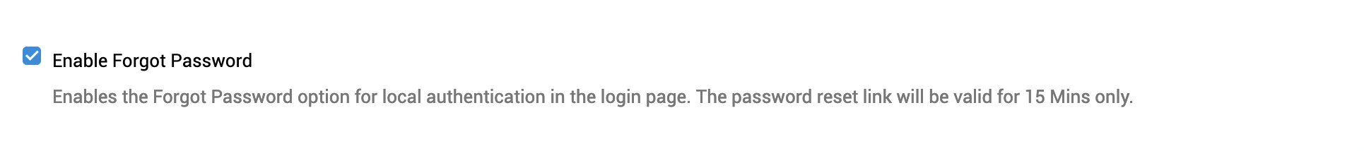 Enable Forgot Password: Under Admin > Security Settings > General, configure the Forgot Password option to be displayed on the login page for users who log in via local authentication. Once enabled, the user can use this option to receive a password reset link in their primary email address. The reset link will be sent only if they provide the user name and the domain name. The password reset link email will not be sent if the email is not configured or associated with multiple profiles. In such cases, the admin will need to manually reset the password.