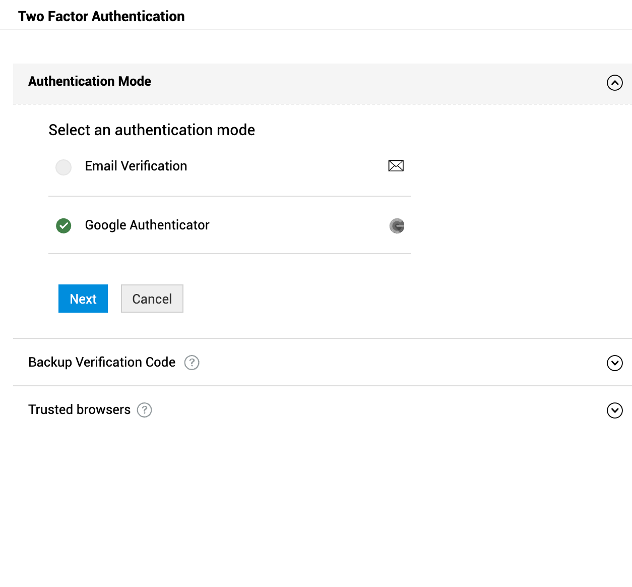 You can manage trusted browsers, modify mode, view, download, or generate backup codes from the user panel.