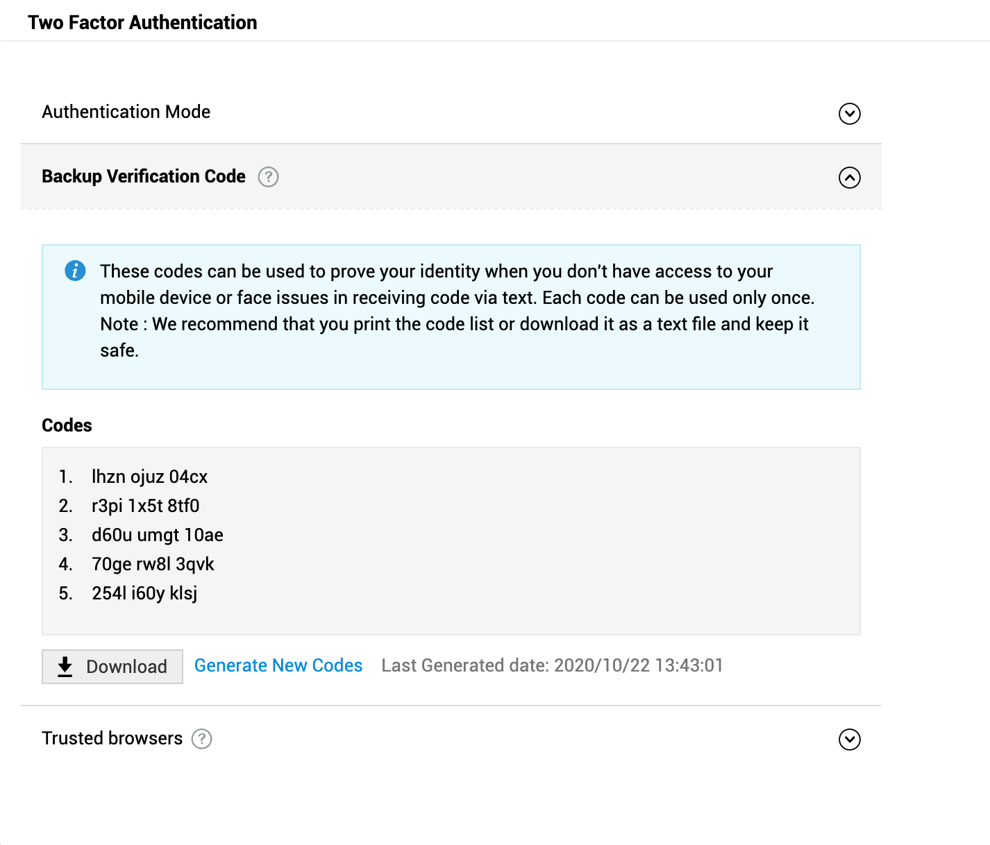 • Each backup verification code can be used only once and make sure that you generate a new set of backup verification codes before using all the codes in the existing set.