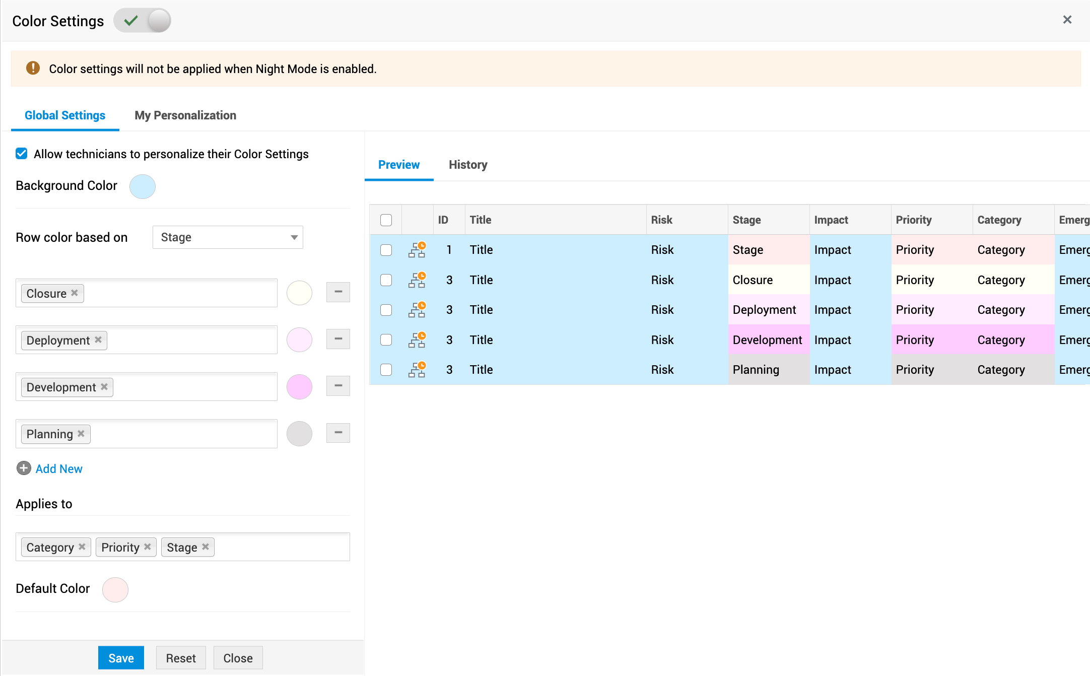 Color-code release requests in list view and classic view based on release attributes such as risk, stage, impact, priority, category, and urgency. This enables technicians to identify and track release requests easily.