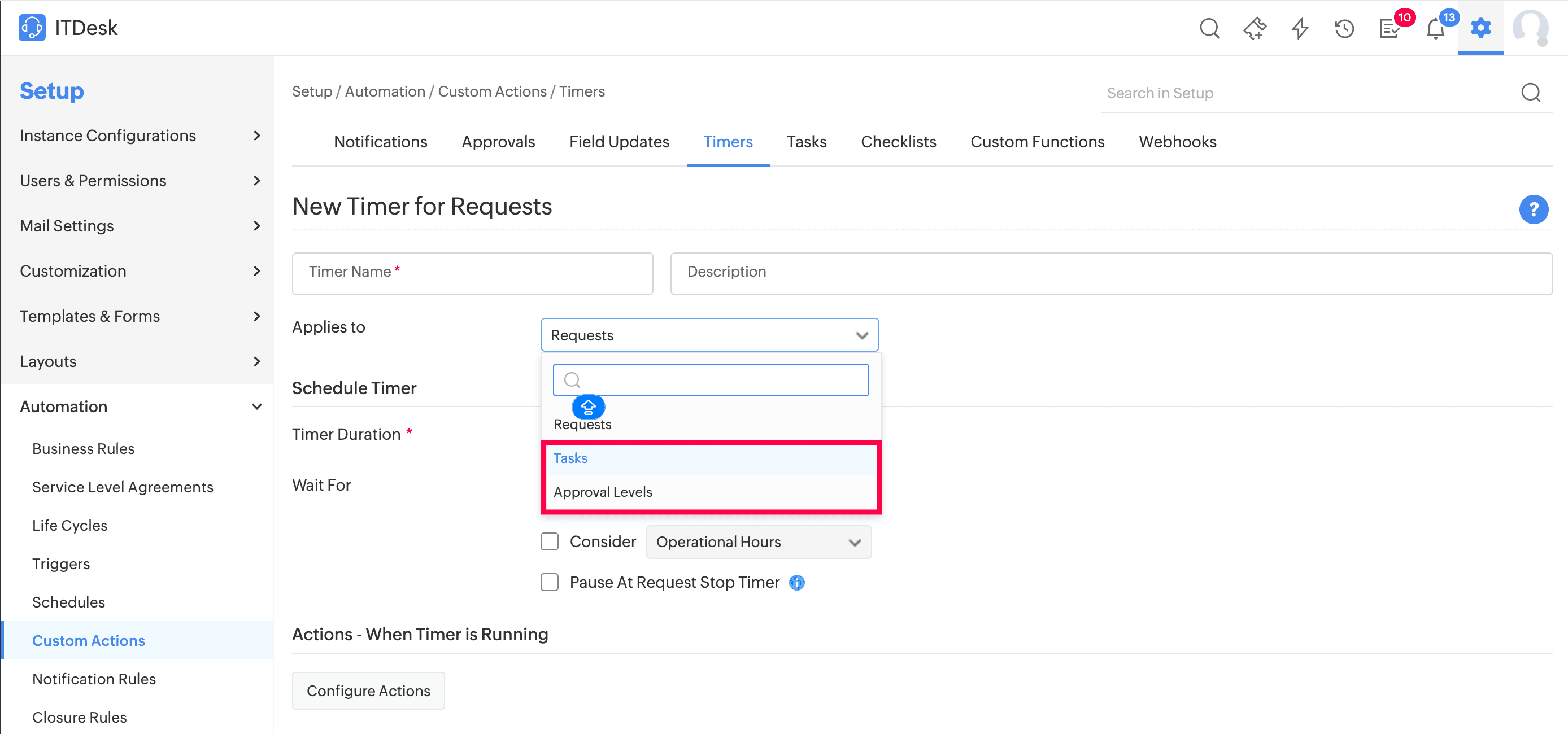 It is now possible to configure the system to stop the timer for those tickets that are awaiting approval. If stop timer is enabled, timer will be automatically stopped for requests. You can also configure the status that must be set while the request ticket awaits approval.