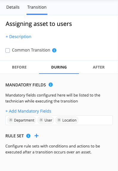 Transitions denote the movement of the asset from one state to another. They are condition-based actions that can be configured to be performed at any time during the movement (before, during, or after).