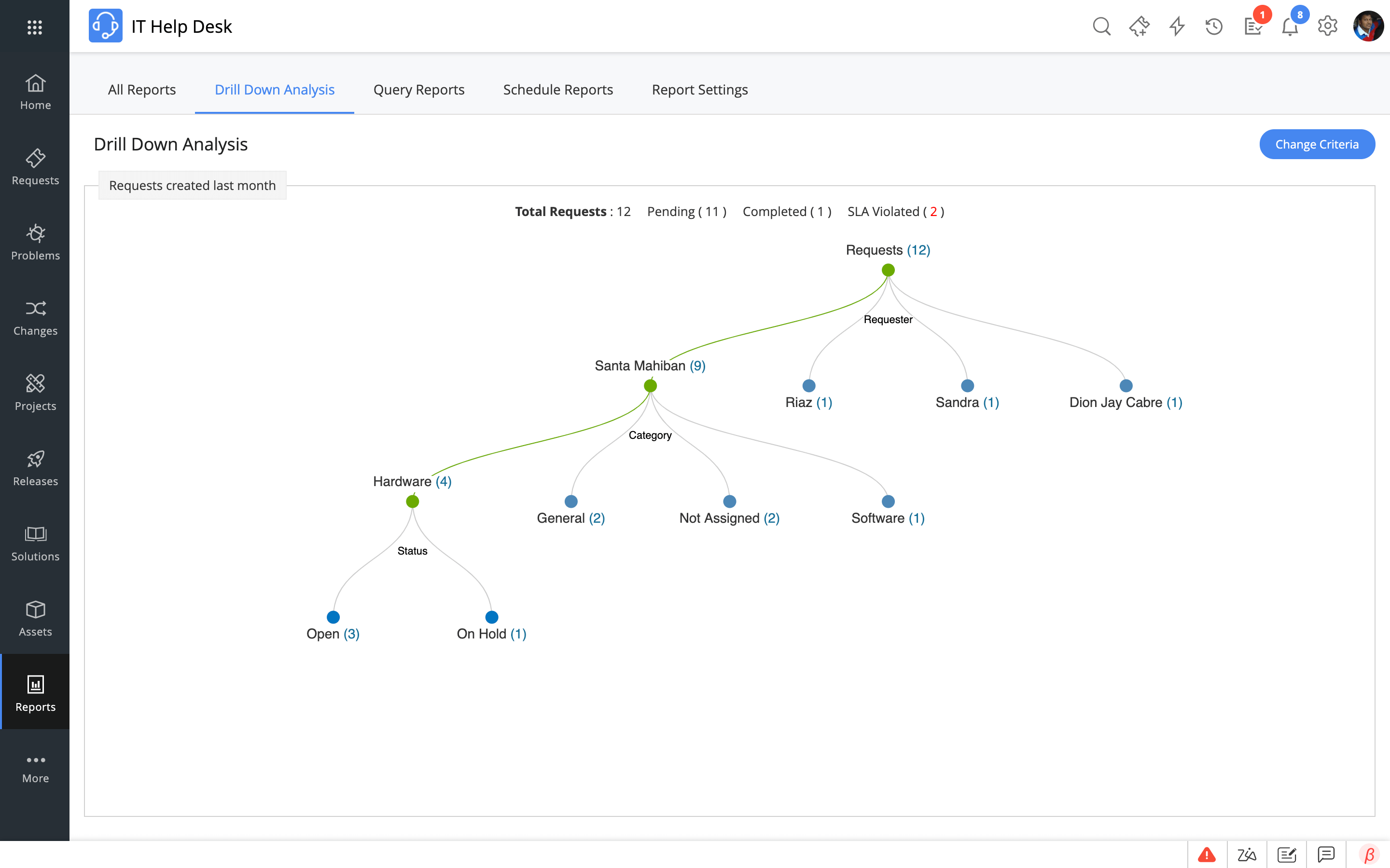 Reports are vital to track and analyze the overall health of the service desk to identify areas of improvement. They help identify performance issues, explain why a problem occurred, and recommend a course of action. Using reports, a service desk manager can effortlessly make tactical decisions that can optimize service desk operations, forecast trends, streamline the workflows of processes, etc.