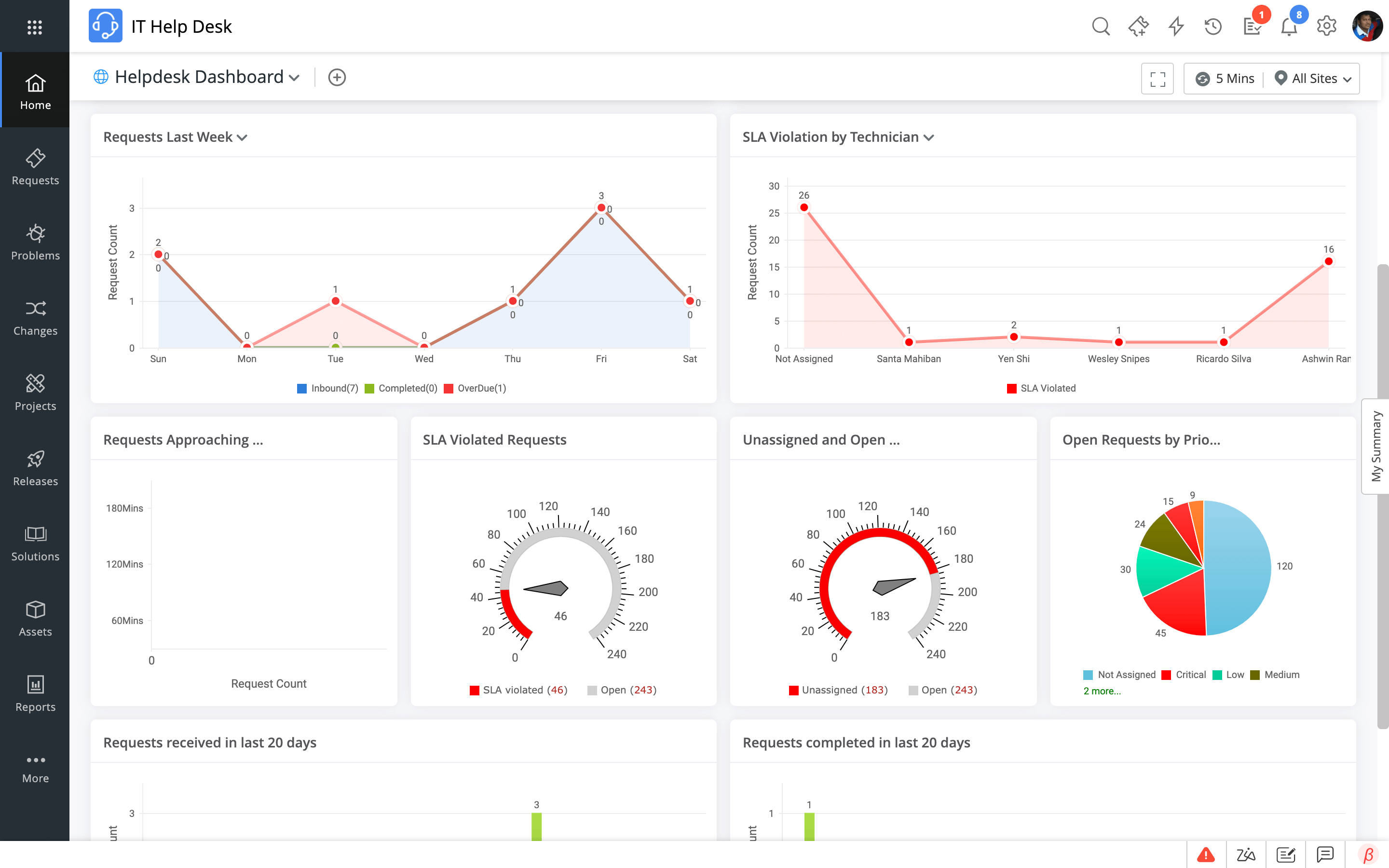 Dashboards are often used across various levels of an organization. They provide strategic guidance on the performance of the IT service desk and help organizations assess the service desk's impact on certain objectives. By customizing dashboards, organizations can get insights into a particular operation and present the right information to the right people at the right time. From assessing the current performance of the relevant key performance indicators (KPIs) to monitoring and spotting any discrepancies in processes, dashboards can give a complete understanding of the role of the service desk from a business point of view.