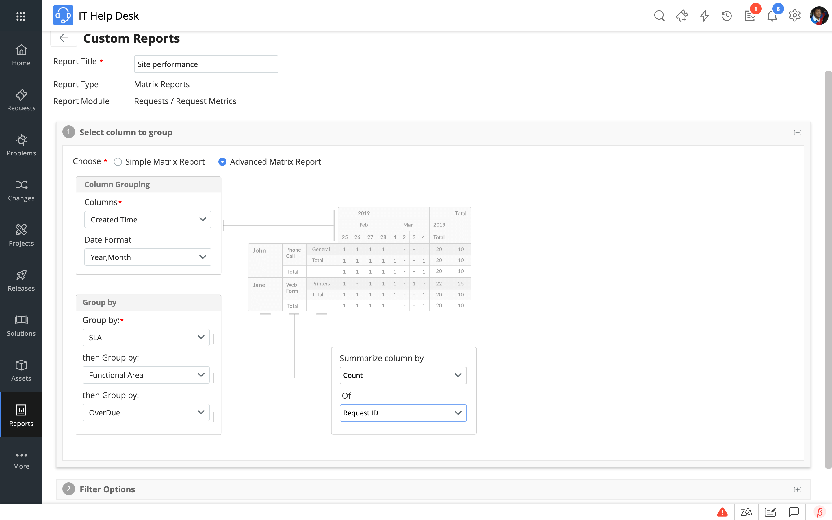 • ServiceDesk Plus supports multiple types of reports, including query reports and KPI reports. The user-friendly Reports Wizard takes you through the entire process of custom report creation in a few easy steps.