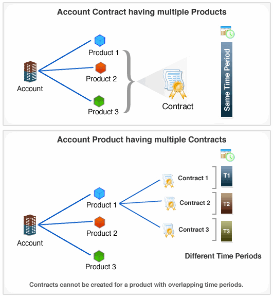 Contracts can be created for an account with single or multiple products. A service contract can be associated to an account with multiple products in the same time period. Multiple contracts can be associated to a single product, provided the time period of each contract does not overlap. Apart from associating service contracts to products, contracts can be associated to accounts alone. Thus based on the associated contracts, any request raised for the account should be resolved based on the support plan and applied due by time.